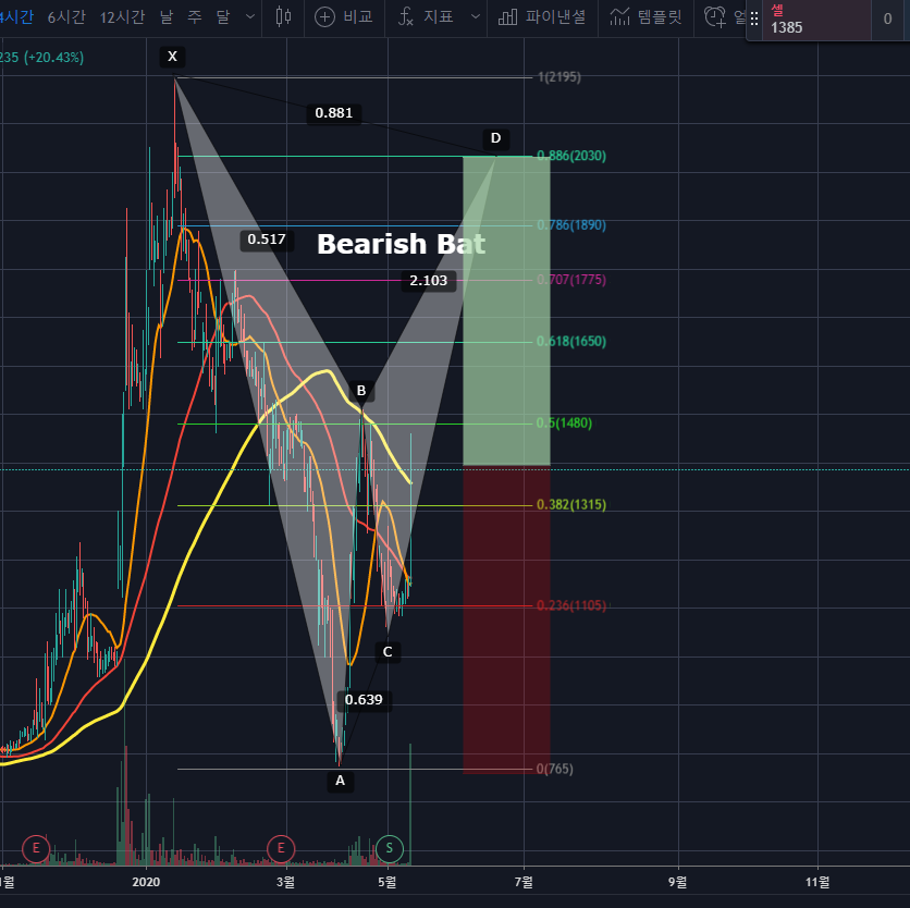 주연테크를 장이 열릴 때 1,385원 근처에서 매수한다면, Bearish Bat과 엘리엇웨이브 B파의 끝인 2,030원을 TP(Target Point)로 가져갈 수 있어보입니다. 해당 구간이 오면 더한 상승이 있을 것 같더라도 전량 익절매 하는 것이 좋아보이며, 이후 큰 하락이 일어날 것이므로 관망을 하다가 Bearish Bat Pattern의 CD 피보나치 값의 0.618인 1,425원즈음에서 재매수하는 것이 좋아보이네요.
