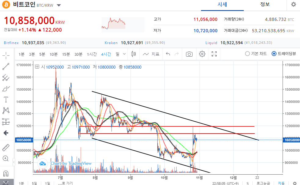 아래는 업비트 원화차트입니다. 현재 10,858,000원입니다. 천만원을 넘으니 좋네요.
