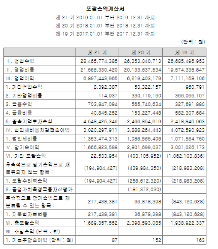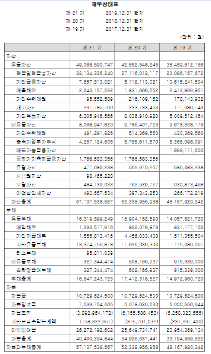 자산이 증가하고 부채가 감소하였습니다. 부채의 자산대비 비중은 적은 편은 아니네요.