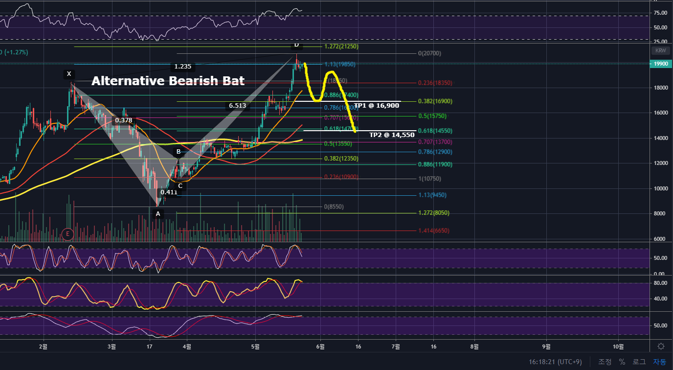기술적분석에서 Alternative Bearish Bat의 PRZ테스트, 곧 RSI 일반하락다이버전스 출현, 스토캐스틱 데드크로스 임박 등이 있겠네요.