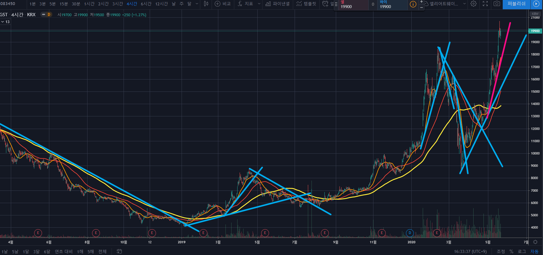 GST 주가를 보면, 20년 3월 8,500원대의 저점 이후 최근 2만원까지 급격한 상승을 하였습니다. 2달만에 2배 이상 상승한 것이네요.