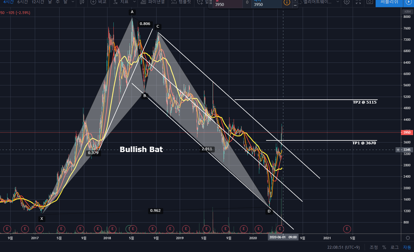 이곳에서 노란색 120이평이 있는 2천원대 후반정도는 피보나치 0.5되돌림 자리부근으로, 여기에서 지지받는다면 재차 상승하여 TP인 5,115원까지 무난히 상승할 것으로 보여집니다.