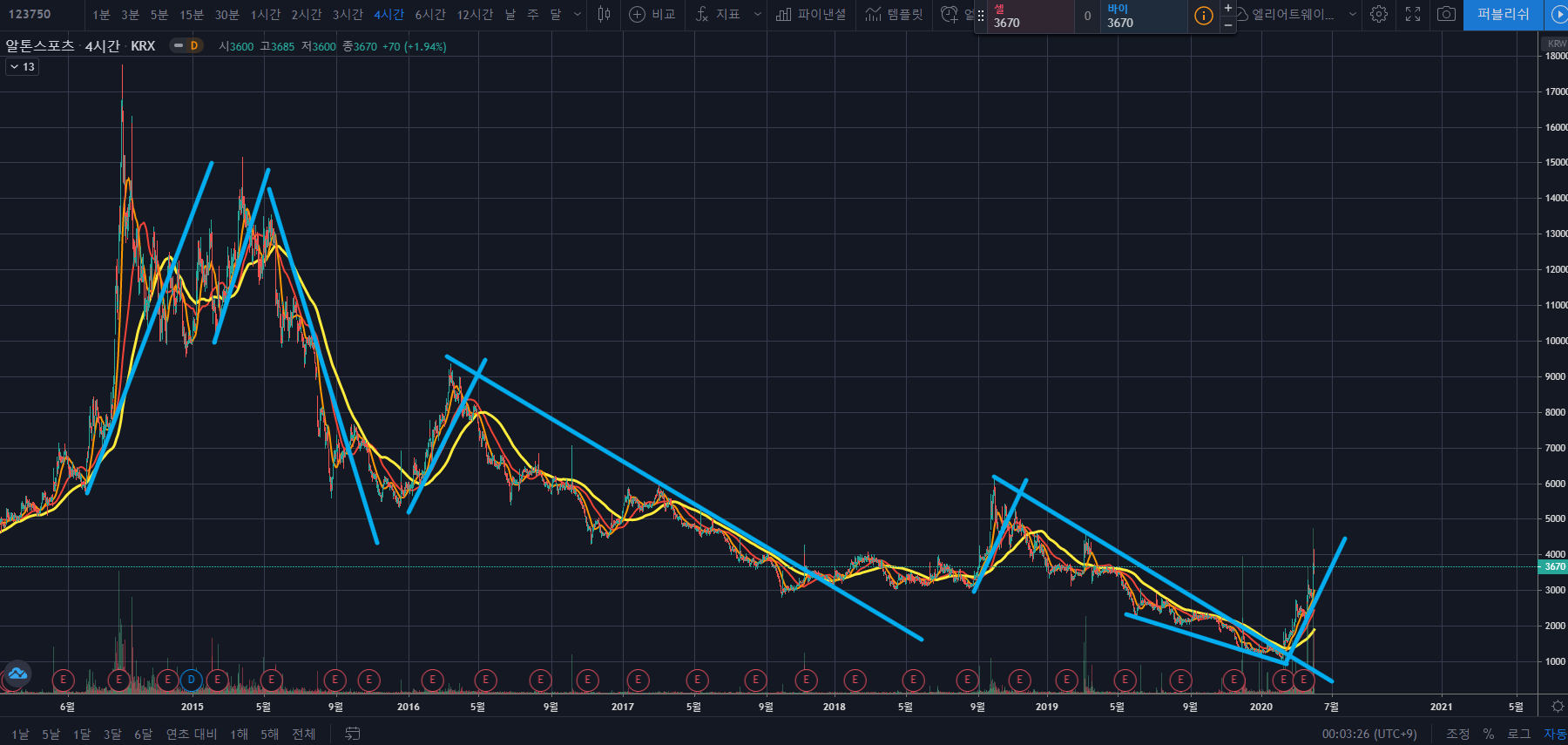 그렇게 된다면 노란색 120이평이 저점을 높이는 쌍바닥 형태가 되면서 하락추세를 종결하고 상방으로 크게 상승할 것 같습니다.
