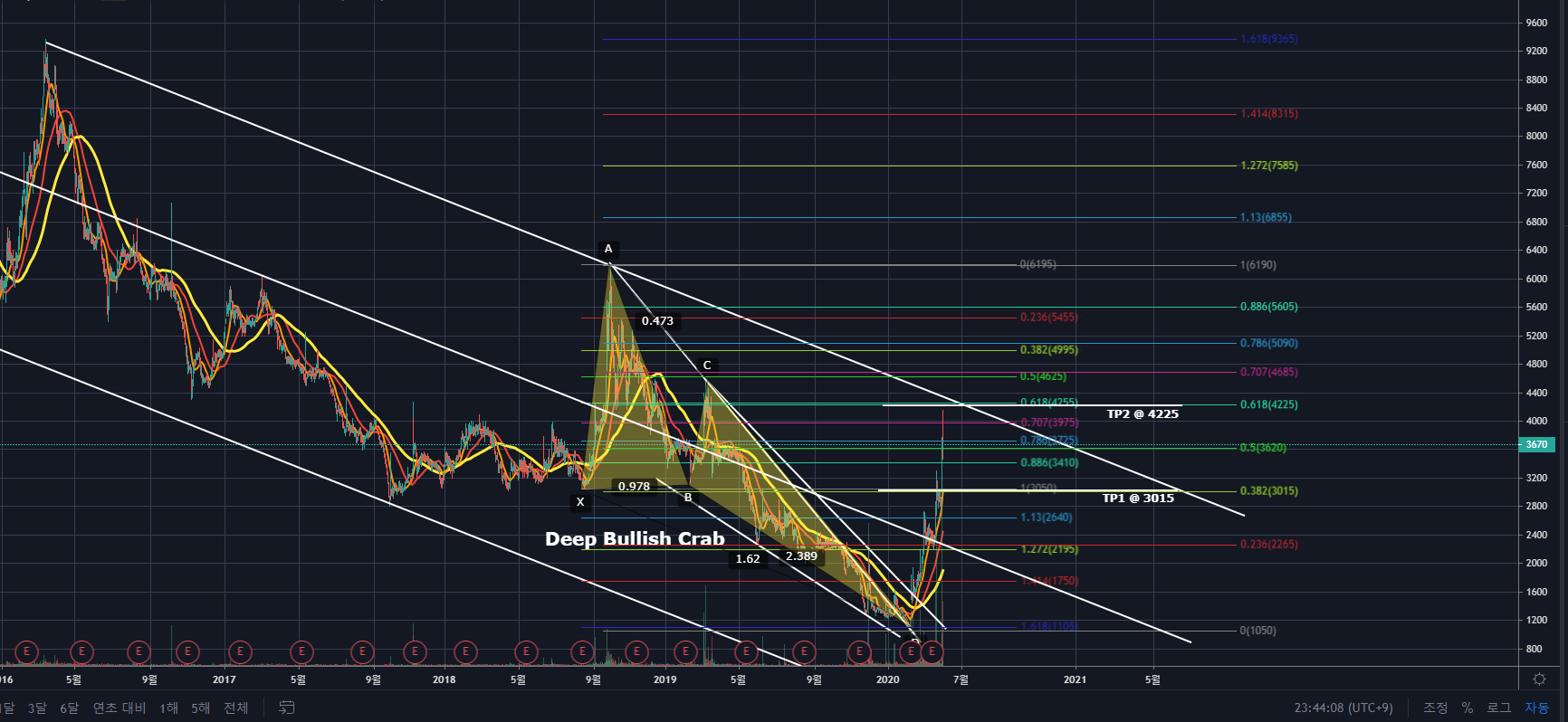 현재 TP1을 지나 TP2에 근접한 상태이며, TP2에 도달하면서 큰 하락채널링 상단을 터치할 것으로 보입니다.