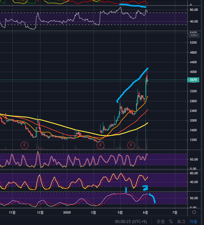 1천원 저점에서 4천원 고점까지 상승하였으니 4배 상승한 것이네요. 이렇게 상승피로도가 심하고, 하락시그널이 나오는 종목은 추격매수하기 보다는 눌림목을 기다리는 것이 좋습니다.
