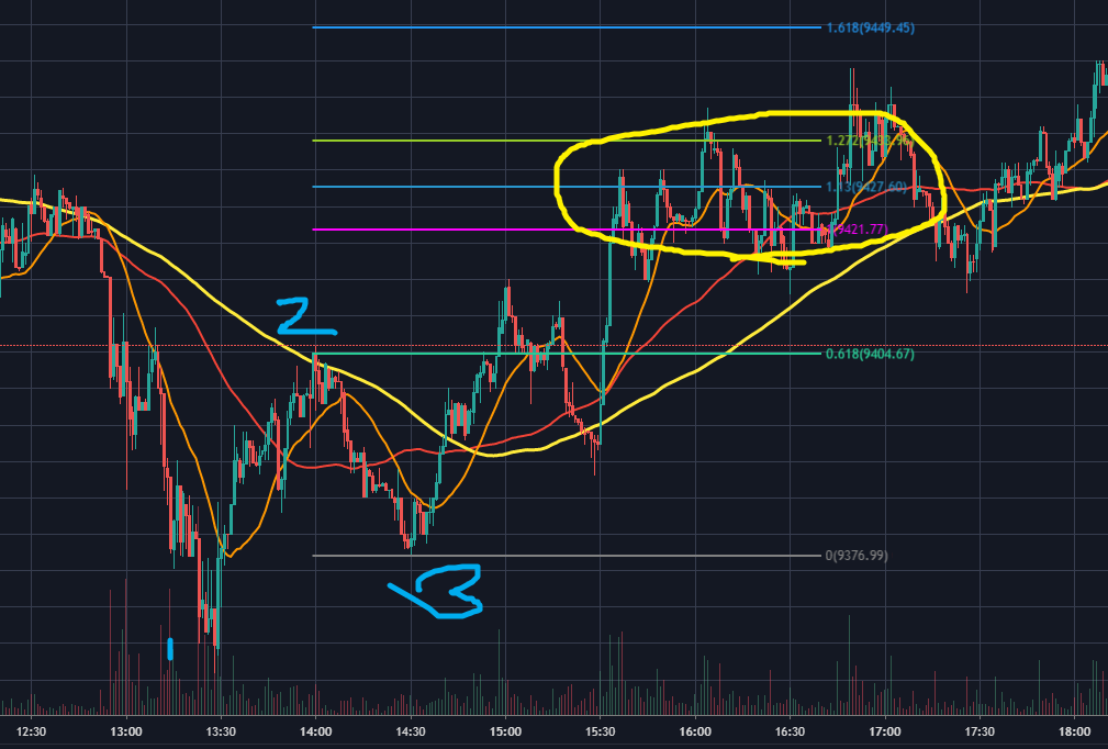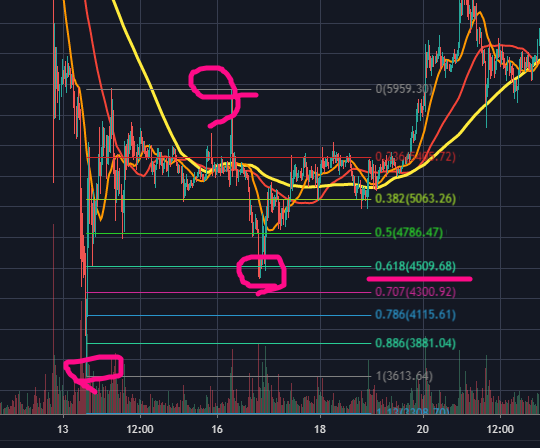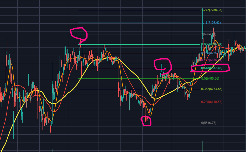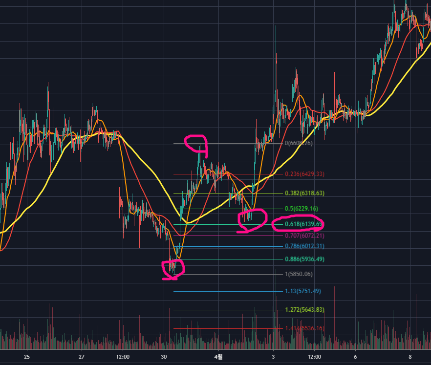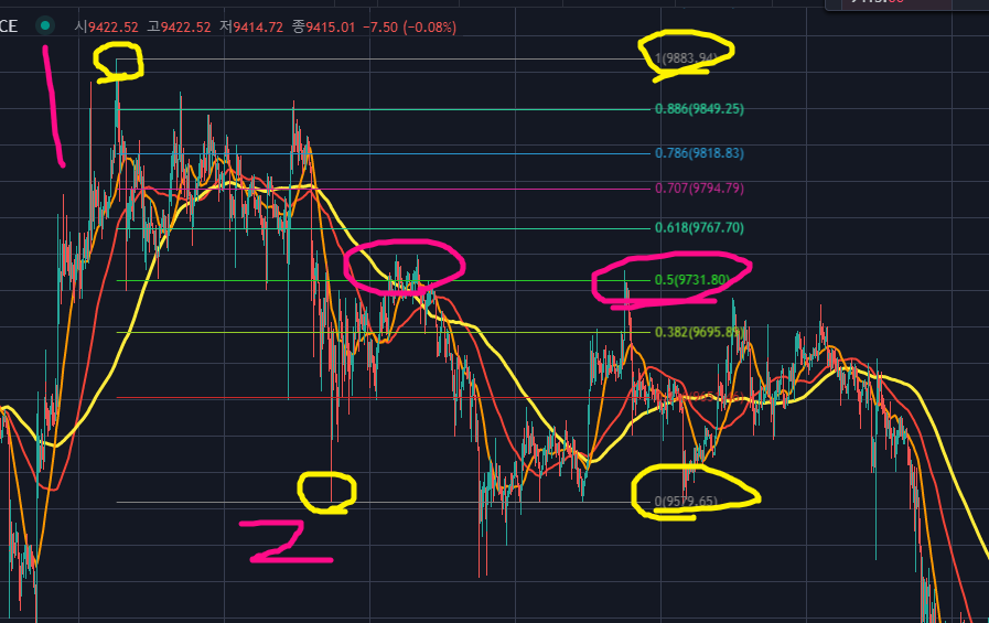 그 중 0.5와 0.618은 강력한 지지 혹은 저항역할을 하기 때문에 이 자리에서는 보유포지션을 정리하거나, 신규 진입을 하기 좋은 자리입니다.