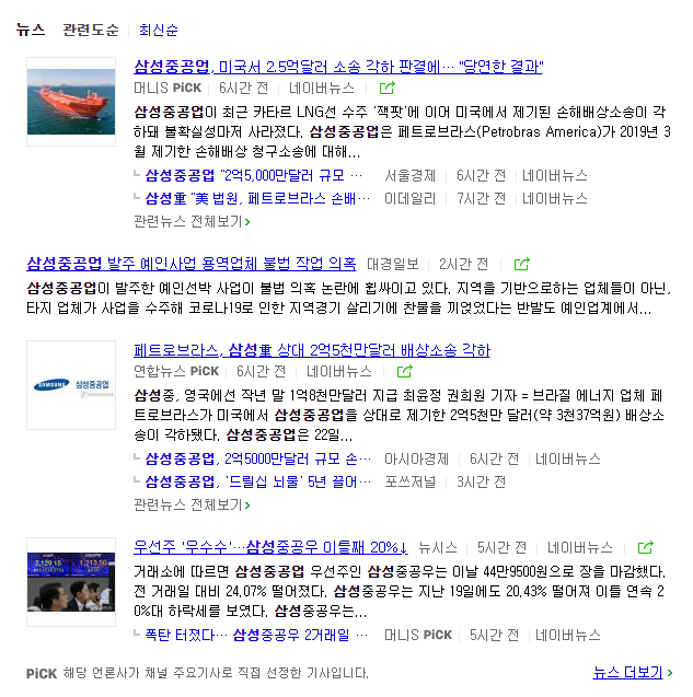 삼성중공업 네이버 뉴스를 보면, 좋지 않은 소식들이 즐비합니다. 아무래도 횡보조정을 하기 위한 밑작업이 아닐까싶으며, 횡보조정 후 상승할 때 호재료가 나오면서 큰 상승을 줄 것 같습니다. 이후 다시 악재가 터지며 큰 조정이 이루어지겠죠.