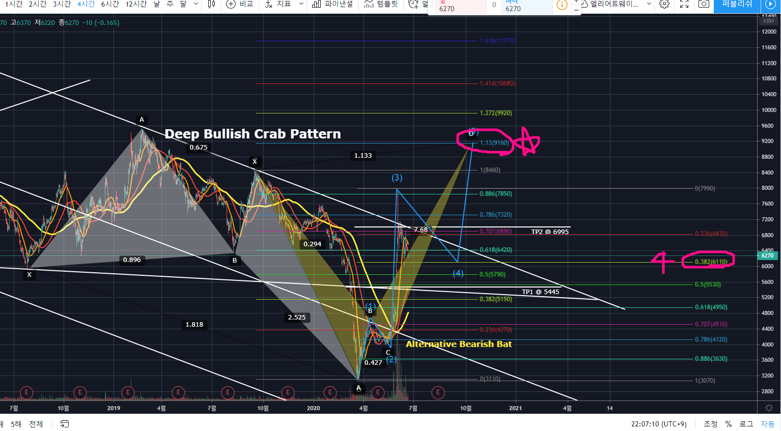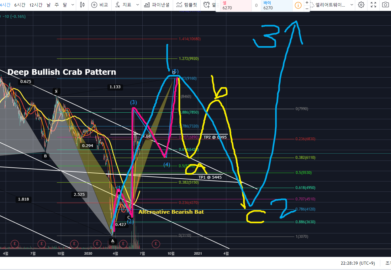 Deep Bullish Crab 패턴의 PRZ에서 상승반전하여 TP2까지 상승하고 있으며, 엘리엇웨이브 충격파동 3파가 나오고 4파 횡보조정이 이어지고 있는 것으로 보이네요.