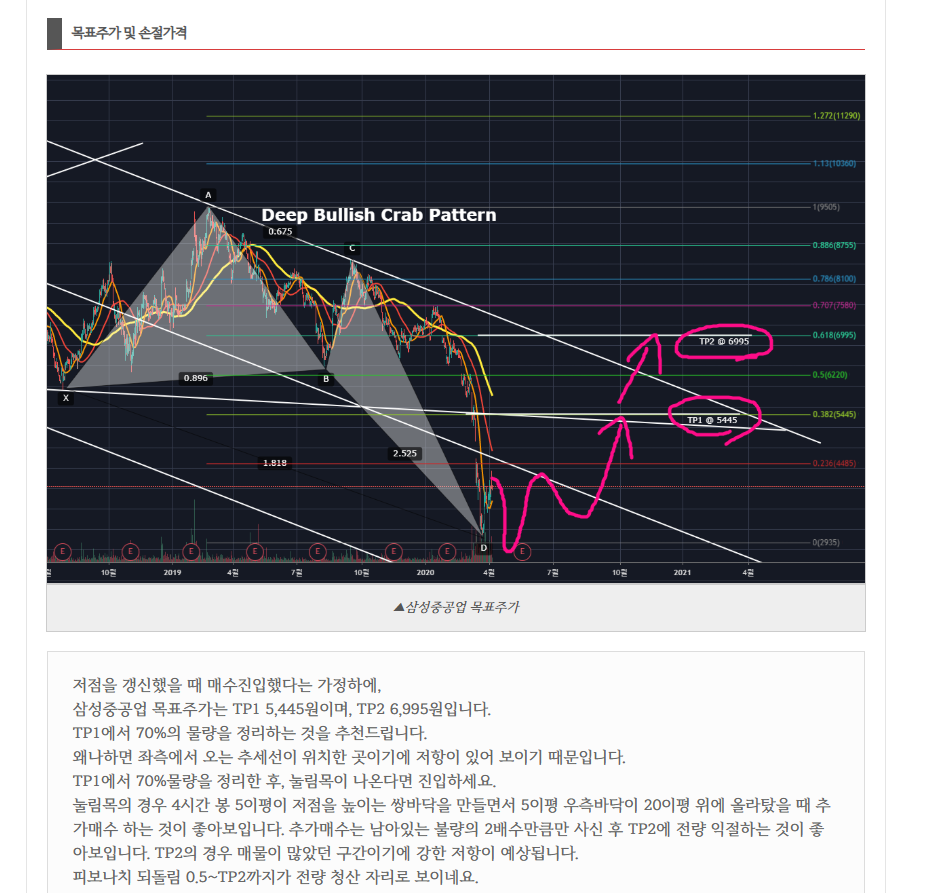삼성중공업은 지난 분석의 Deep Bullish Crab Pattern의 1.618 PRZ를 테스트한 후 상승반전하여 TP2에 도달한 상태입니다.