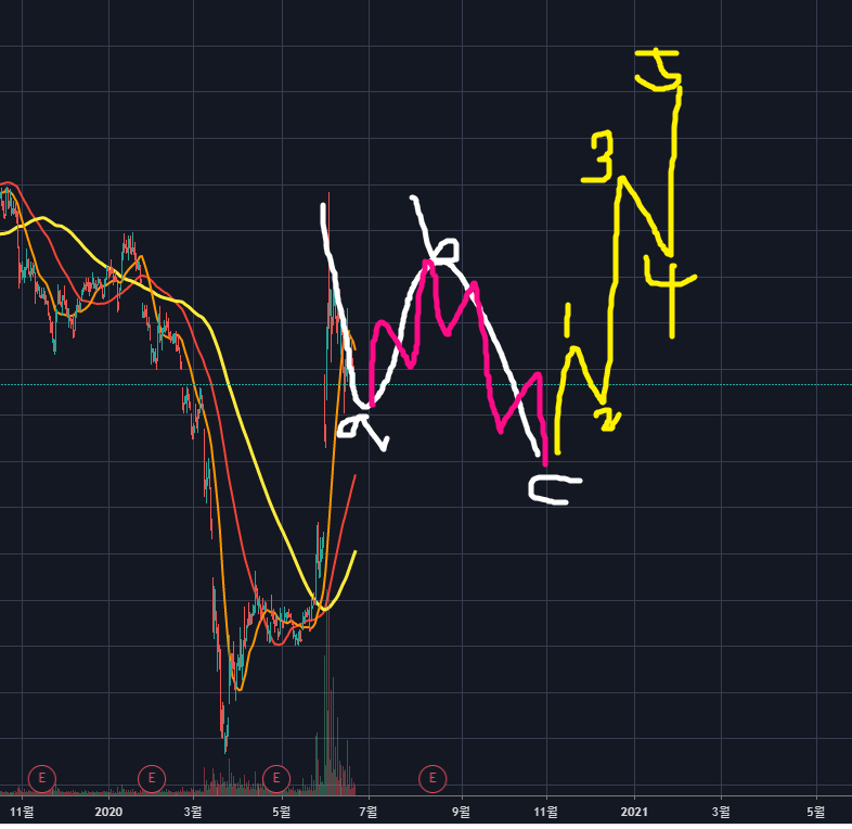위와같이 빨간색 4파 조정 후 5파 상승한다면 노란색 ABC조정을 줄 것이고, 이후 아주 큰 상승랠리가 올 것 같네요.