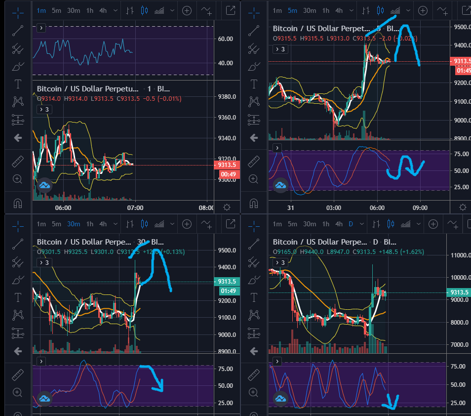 좌상단부터 1분, 5분, 30분 1일봉이 순서대로 되어있습니다. 현재 상승 후 조정 중에 있으며, 재차 상승하여 5분봉 201212스토캐스틱이 위로 올라가다 꺾이고, 30분 스토캐스틱 1066이 그대로 우하향하며, 1일봉 533 스토캐스틱이 계속해서 우하향한다면 8k대까지 내려갈 수 있지 않을까싶네요.