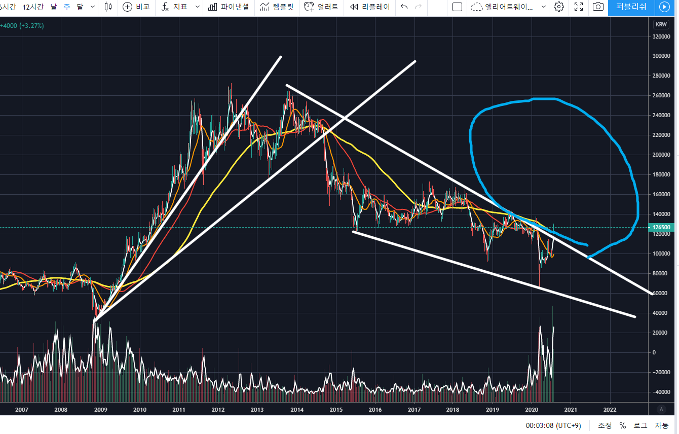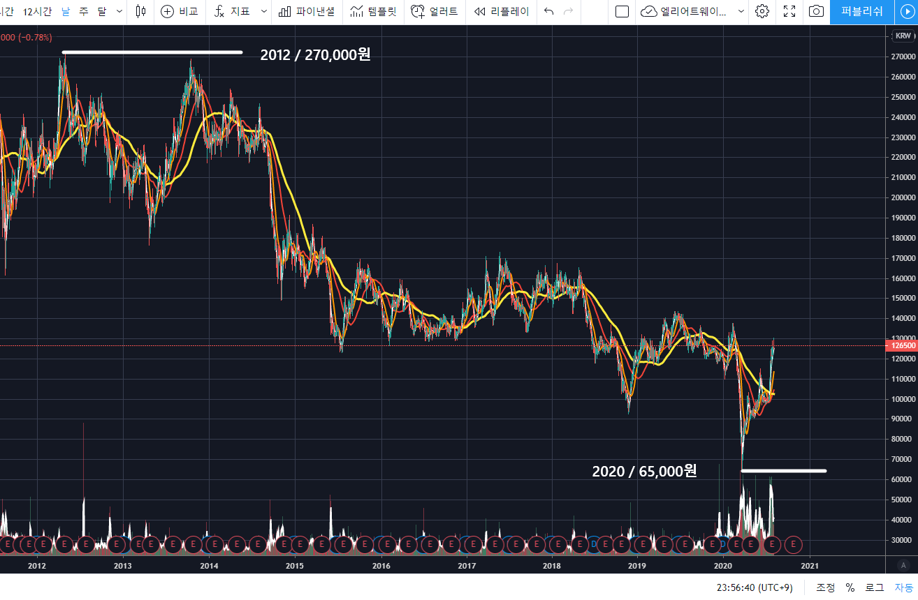 현대자동차는 2012년 27만원의 고점을 갱신 후 계속해서 하락하다가, 2020년 6만 5천원의 저점을 찍은 후 강한 반전을 이루고 있습니다.