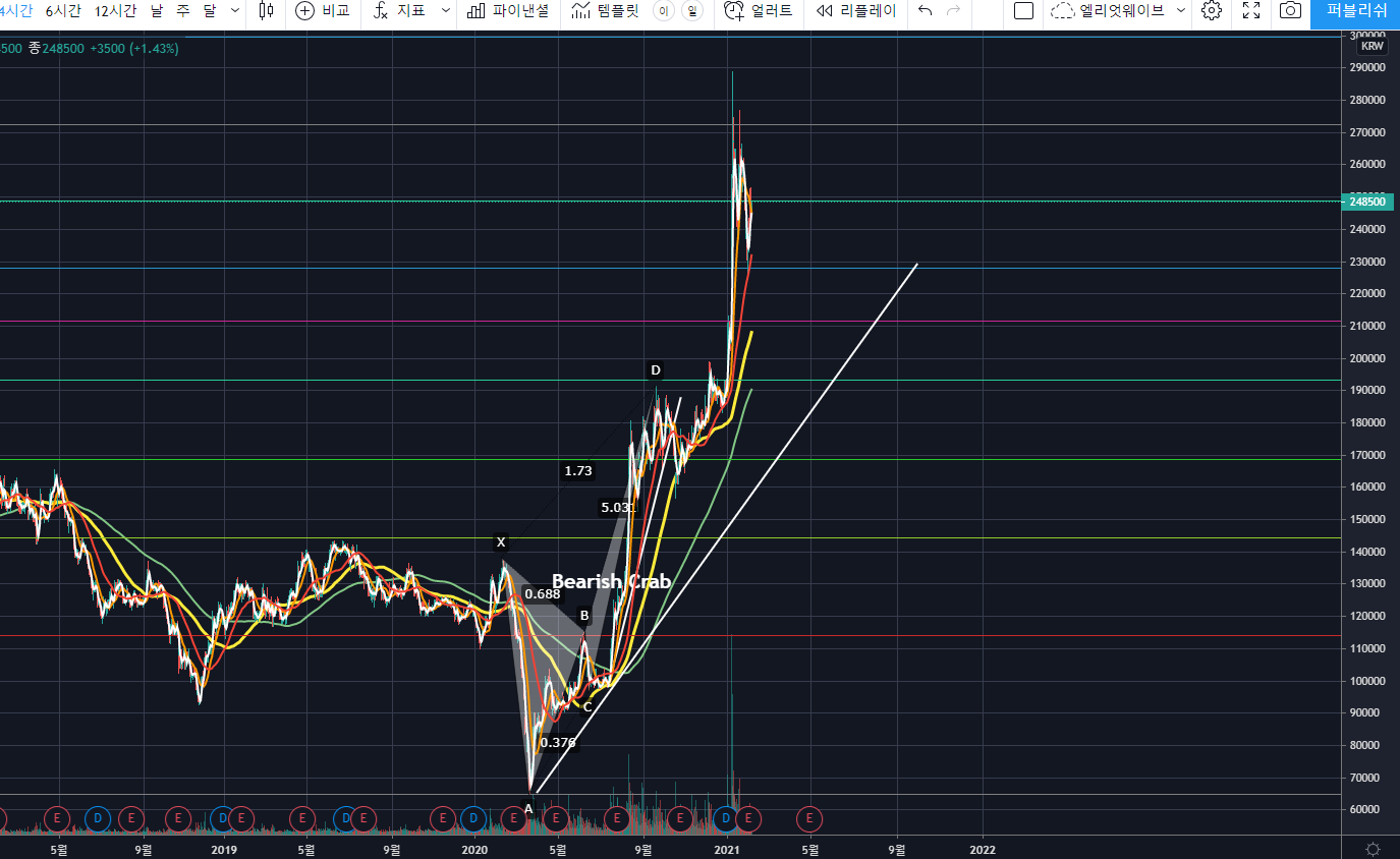 현대자동차 주가는 289,000원까지 상승하였다가 21년 2월 4일 기준 248,500원에 으로 조정중입니다. 분석당시 126,000원 이었으니 2배가 넘는 강한 상승을 하였습니다. 앞으로도 조정이 있따 하더라도 고점을 높이려는 흐름이 나올 것으로 보이며, 고점이 높아지면 그때부터는 강한 조정을 조심하고 분할로 익절매하며 포지션을 종료해가는 것이 좋아보이네요.
