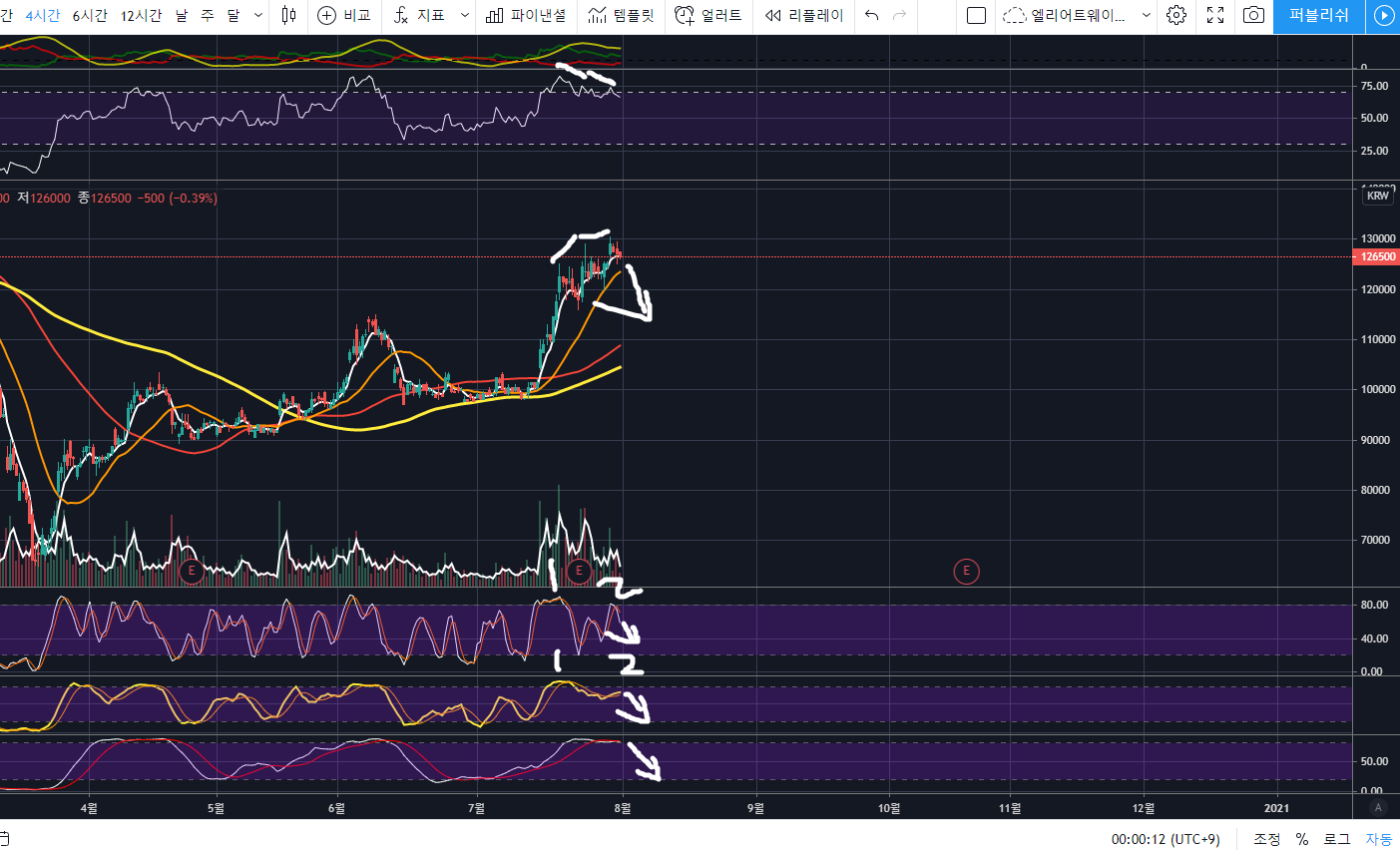 딱 그 구간에서 RSI 일반하락다이버전스와 스토캐스틱 하락시그널이 겹치고 있기에 신뢰도가 높아지네요.