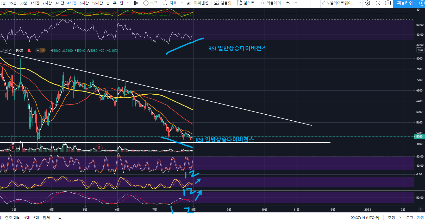 현재 4시간봉 차트를 보면, 일반 상승다이버전스가 강하게 적용된 것을 볼 수 있습니다.