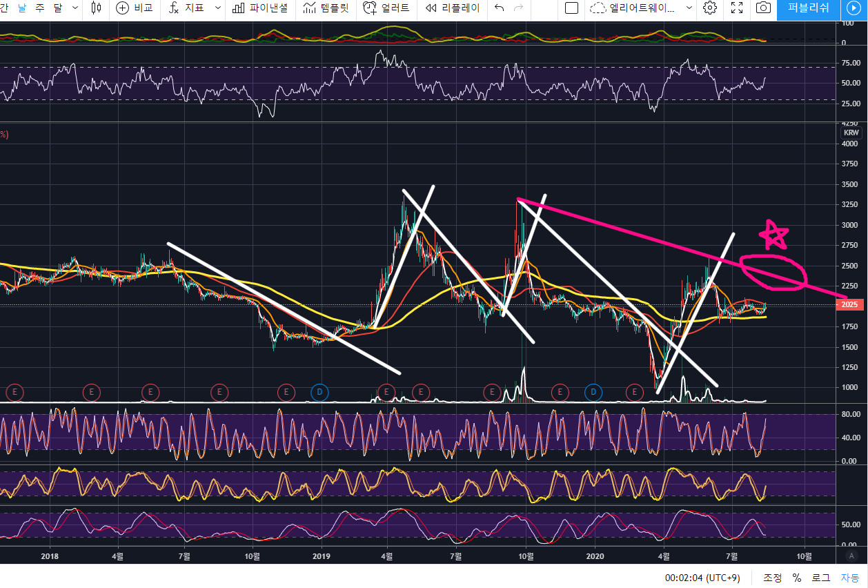 현재 빨간색 우하향 추세선이 위에 있는데, 이것을 상향돌파한다면 큰 시세를 줄 것 같네요.