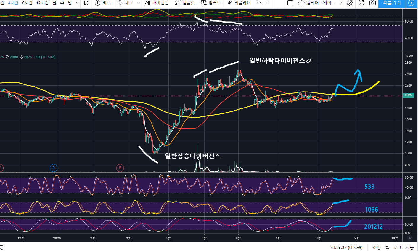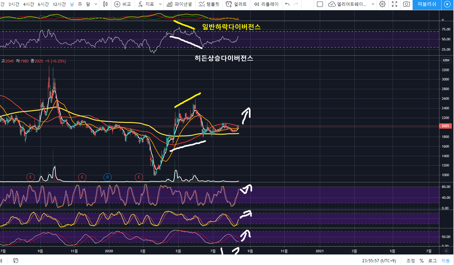 위의 일봉차트를 보면, 노란색 일반 하락다이버전스가 강하게 적용받고 큰 조정이 나온 것을 확인할 수 있습니다.