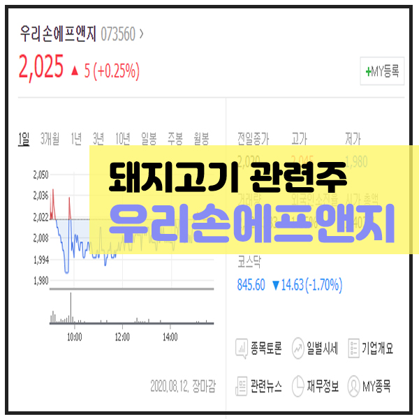당장 8월 11일에는 아프리카 돼지열병의 여파와 큰 홍수로 인해 중국 돼지고기 값 급등해서 1년 전보다 85.7% 올라 대란이라는 뉴스기사가 있습니다. 돼지고기와 달걀 가격이 치솟고 있는 것이 우리손에프앤지에 호재료로 작용하지 않을까 싶습니다.