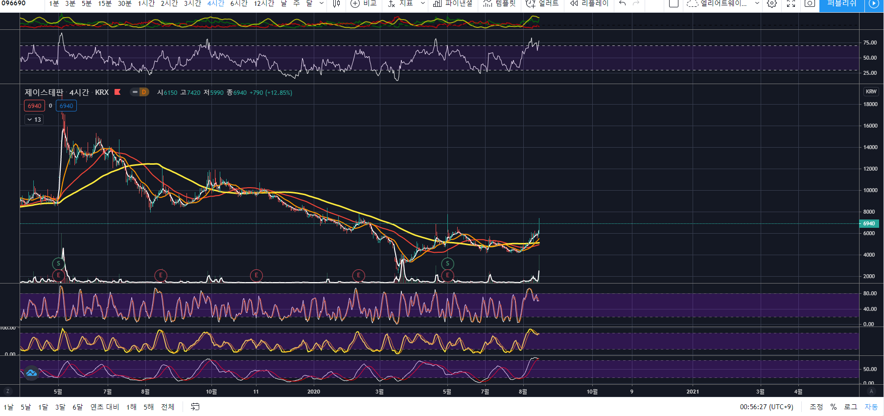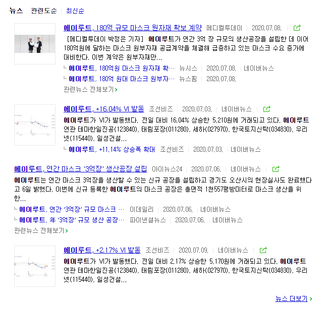 에이루트 네이버뉴스를 보면, 180억 규모 마스크 원자재 확보 계약을 했다는 내용과, 16.04% 급등하여 VI발동 등의 내용이 7월초에 나오고 지금 8월까지는 조용한 편인 것 같습니다. 조정을 주게 되면 더욱 시장의 관심에서 멀어질 것 같으며, 이럴 때 아래의 기술적 분석에 의거한 눌림이 나온 후 큰 상승을 줄 것 같습니다.