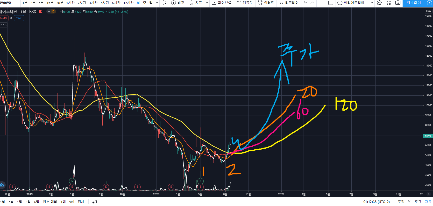 에이루트 일봉차트를 보더라도, 노란색 120이평 위로 주가가 올라와있으며, 주황색 20이평이 저점을 높이는 쌍바닥을 형성하면서 60이평과 120이평위에 올라타 정배열을 만드려고 하고 있습니다.