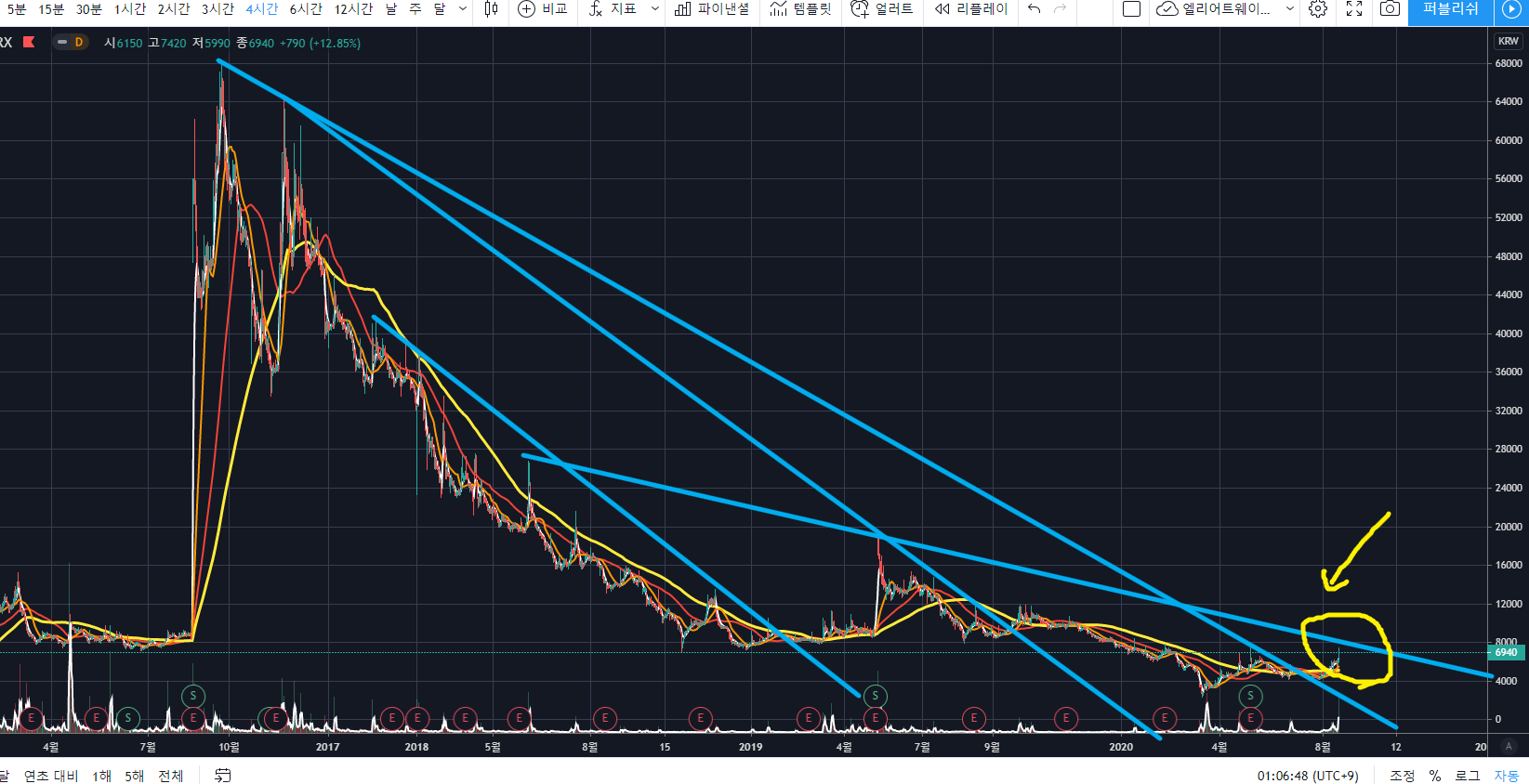 노란색 동그라미 친 곳이 현재 위치이며, 화살표 부근의 추세선을 돌파한다면 큰 거래량을 동반하며 시세분출이 이어질 것 같습니다.