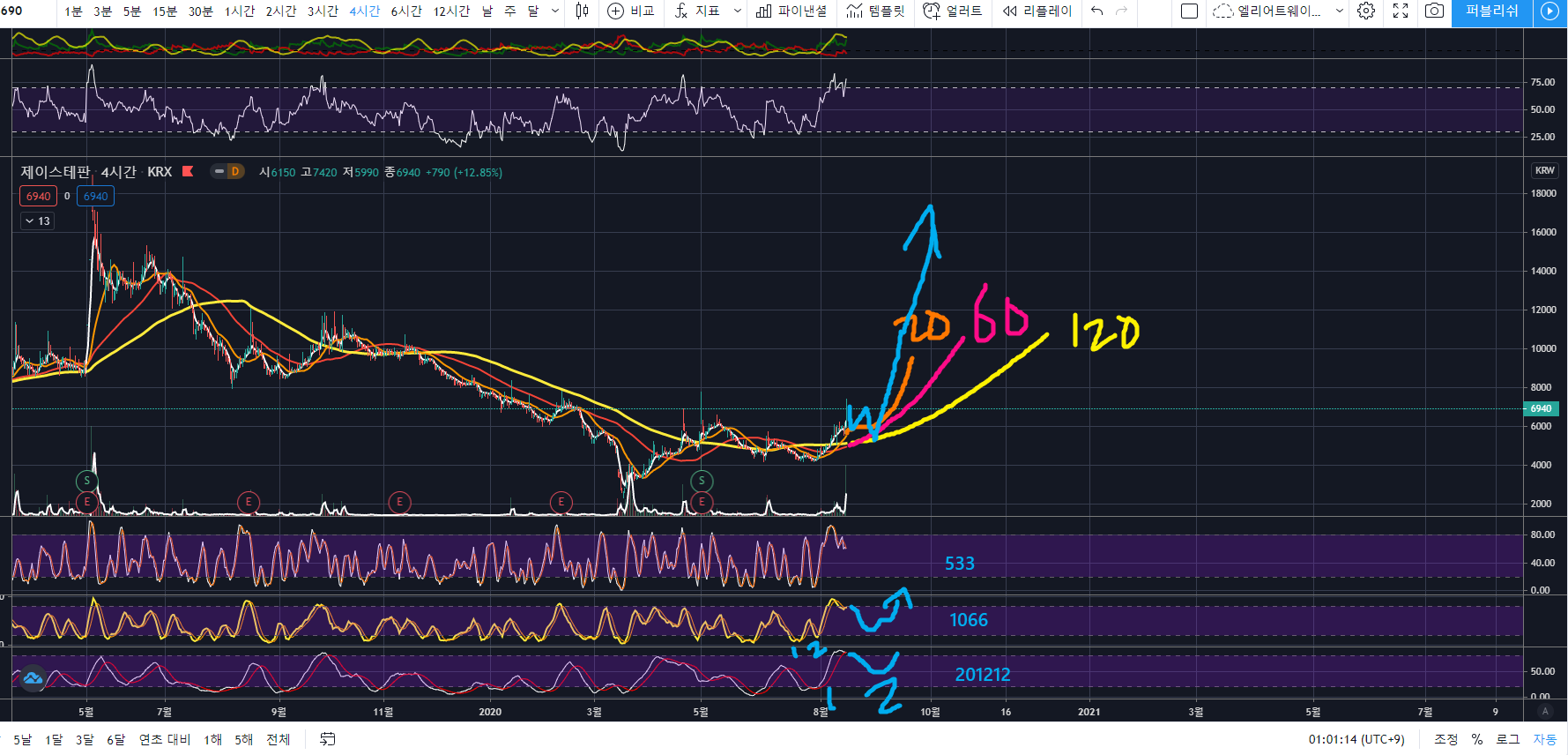 에이루트 주가 4시간 봉 차트를 보면 120이평 위에 올라타 정배열을 준비하고 있습니다.