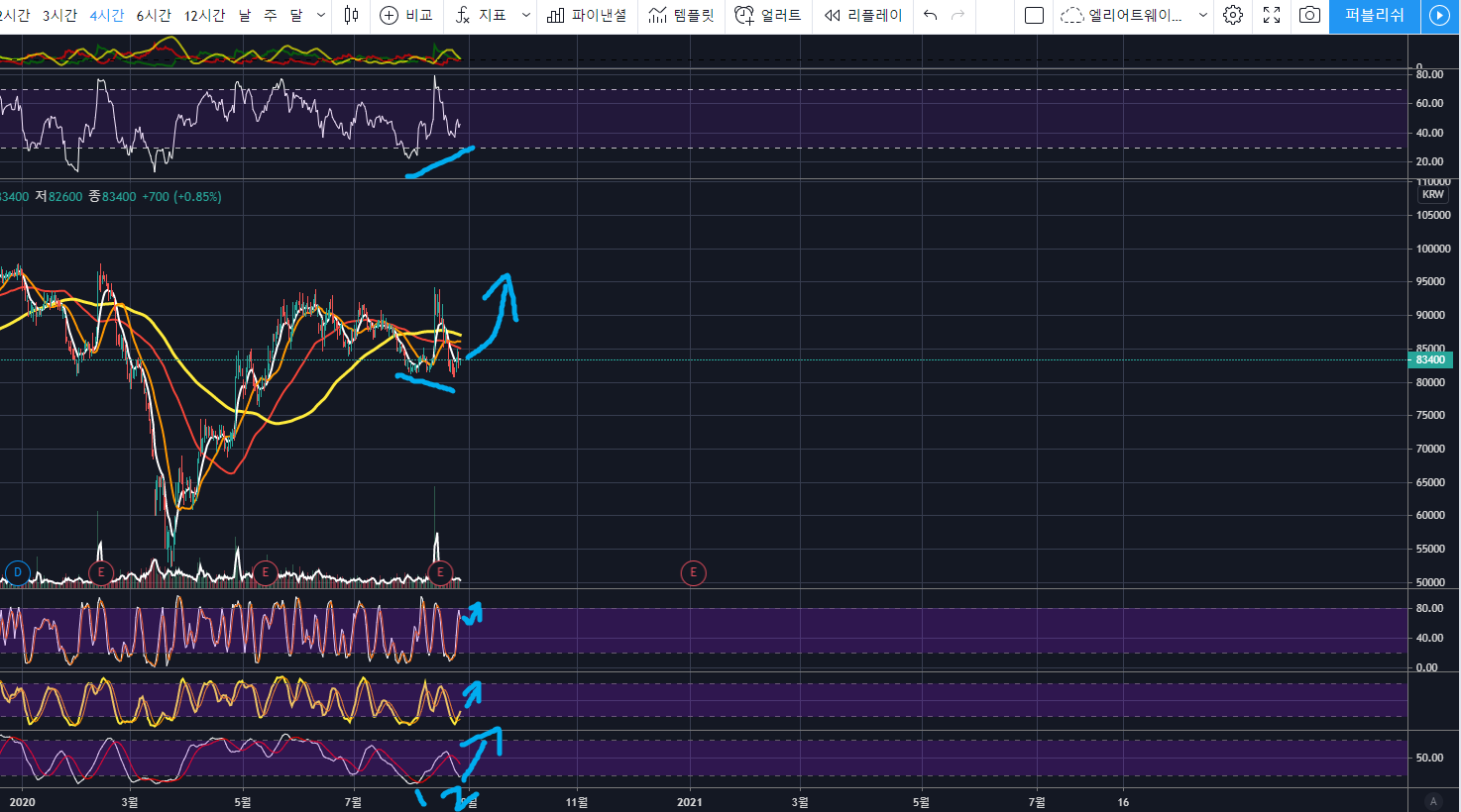 4시간 봉을 보더라도 상승이 임박해보이네요. 금번 상승은 꽤나 큰 스윙자리로 보입니다.