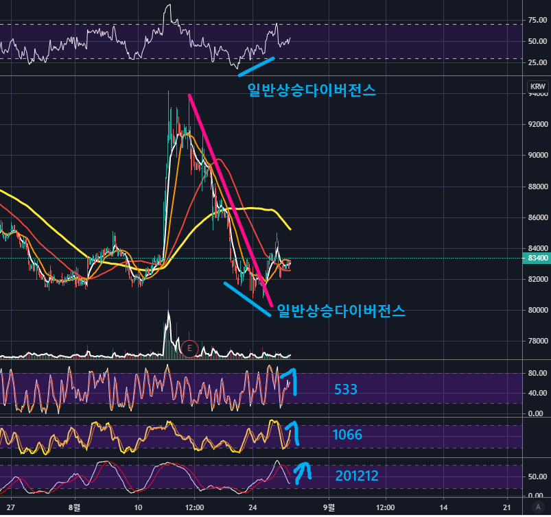 4시간봉을 보면, 역시나 일반 상승다이버전스가 적용받고 있는 것을 확인할 수 있습니다.