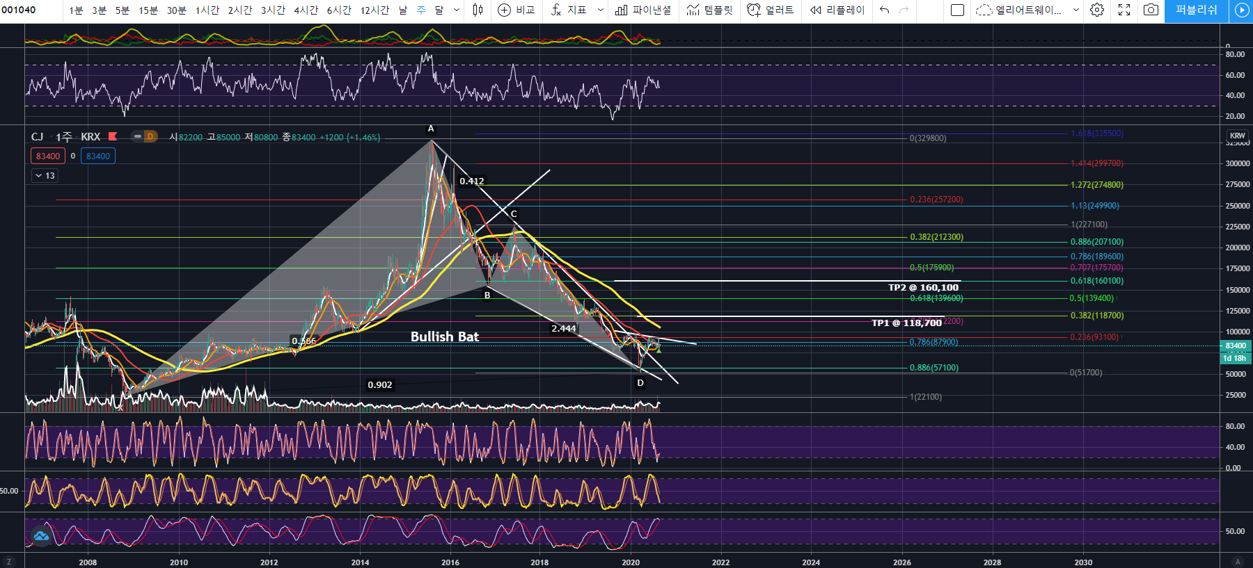 이전 분석과 동일하게, Bullish Bat PRZ에서 반전하여 상승하고 있습니다. Bullish Bat의 TP1이 118700원, TP2가 160100원입니다.