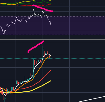 4시간봉차트의 이평선을 보면, 노란색 120이평과 주가의 이격도가 꽤나 벌어져서, 주가가 이평과의 이격을 줄이기 위해 하락할 것으로 보입니다. 이렇게 하락하게 된다면, 빨간색 60이평도 우하향하게 되고, 하락 상승 하락의 패턴을 보이면서 고점을 낮추는 쌍봉이 형성될 것 같네요. 이 쌍봉의 우측 고점이 노란색 120이평을 넘기지 못하는 모양이 나온다면 생각보다 더한 급락이 나올 수 있습니다.