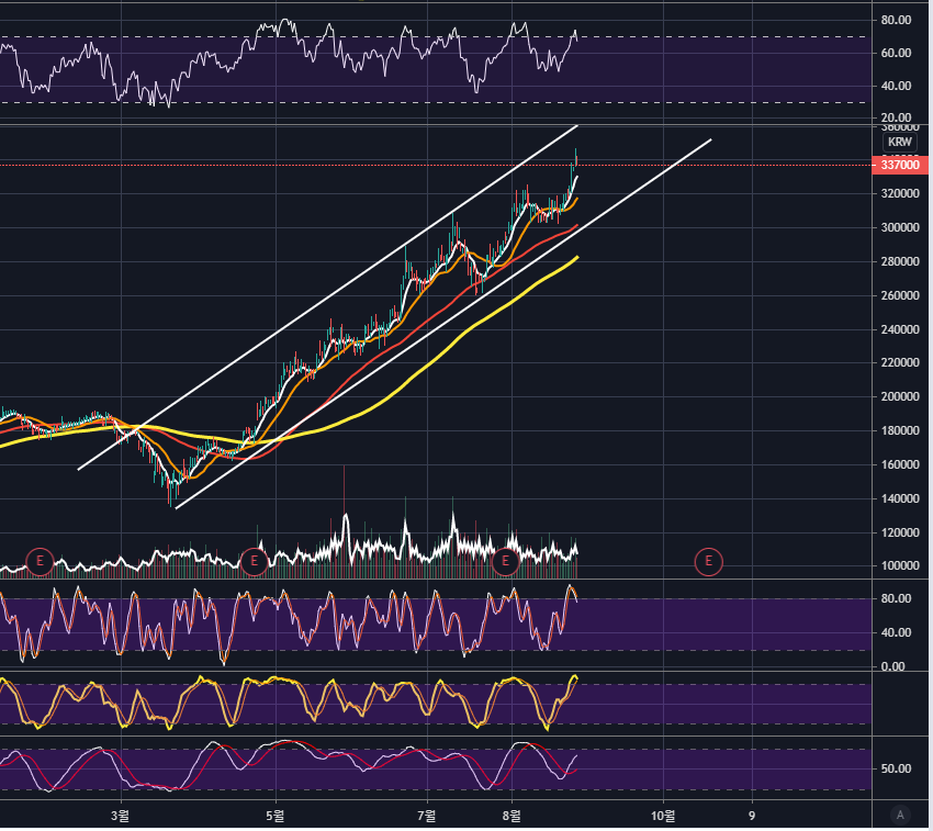 네이버 주가 4시간봉 차트입니다. 20년 3월 140000원대의 저점을 찍고, 20년 8월 28일 현재 337000원까지 상승채널링을 형성하며 상승세를 이어왔습니다.