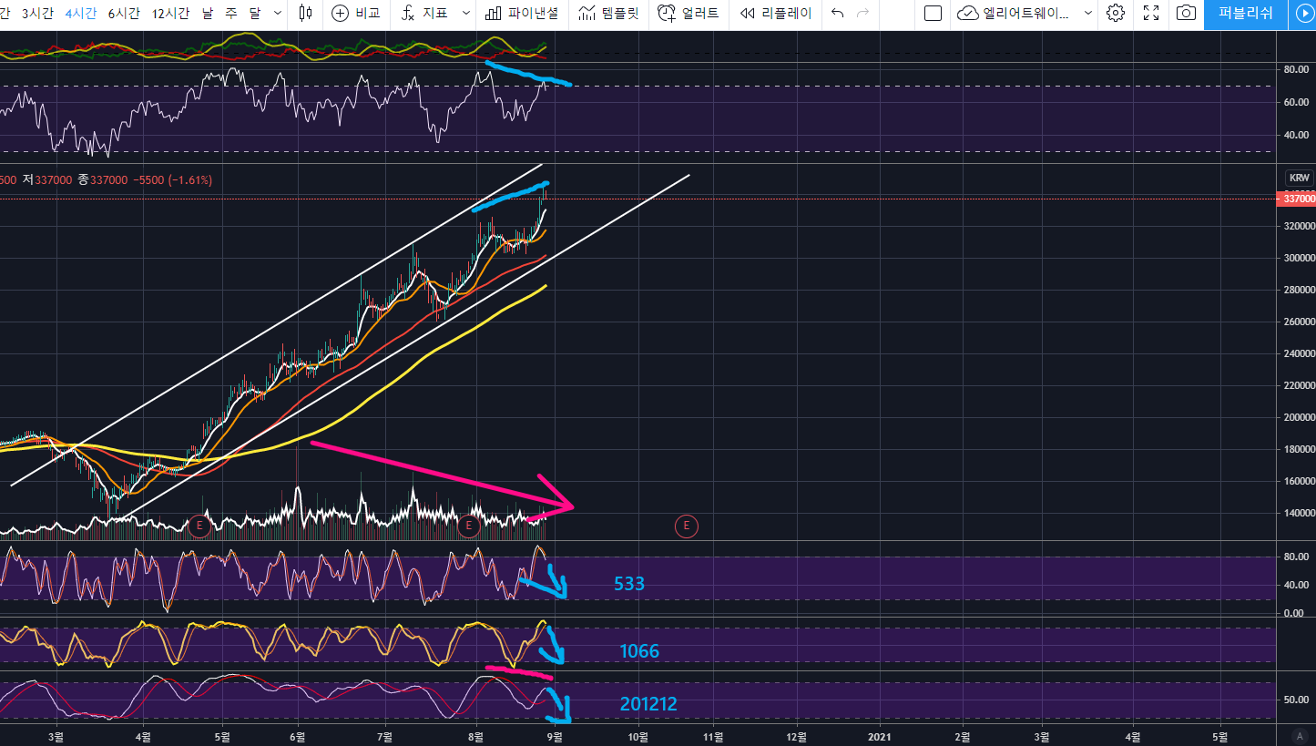 위의 4시간봉 차트를 보면, 스토캐스틱 533, 1066이 데드크로스가 나오며 하락준비를 하고 있고, 201212는 고점을 낮추는 쌍봉형태가 나오며 하락이 도래했음을 시그널로 알려주고 있습니다. 또한 거래량을 보면, 주가가 우상향하는데 반해 거래량은 우하향하고있습니다.