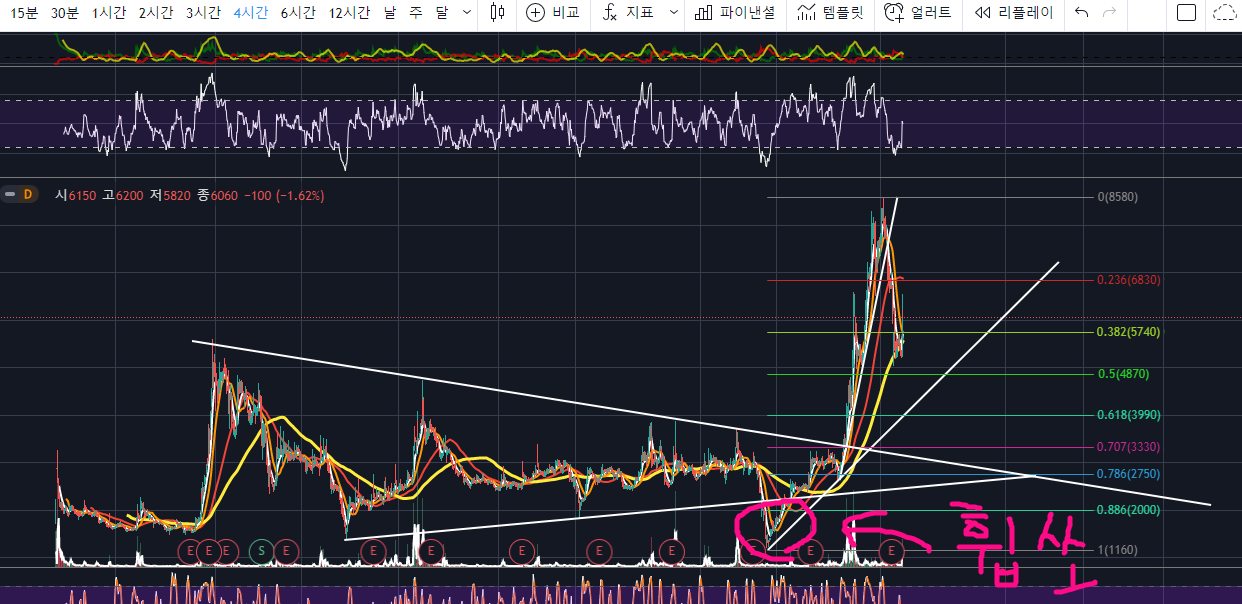 개미털기용 휩쏘라고 볼 수 있으며, 매집된 물량을 가지고 크게 시세분출을 하였네요.