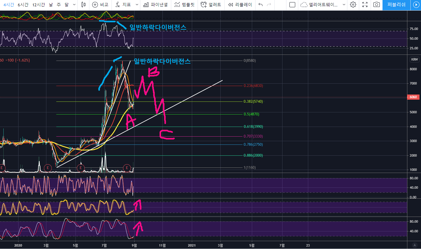 현재 고점에서 급락이 나온 곳을 엘리엇웨이브 A파라고 보고, B파 반등 중이라고 볼 수 있겠네요. 노란색 120이평과의 이격도도 줄였기 때문에 다시 이격을 벌리려는 상승이 일어날 것으로 보입니다.