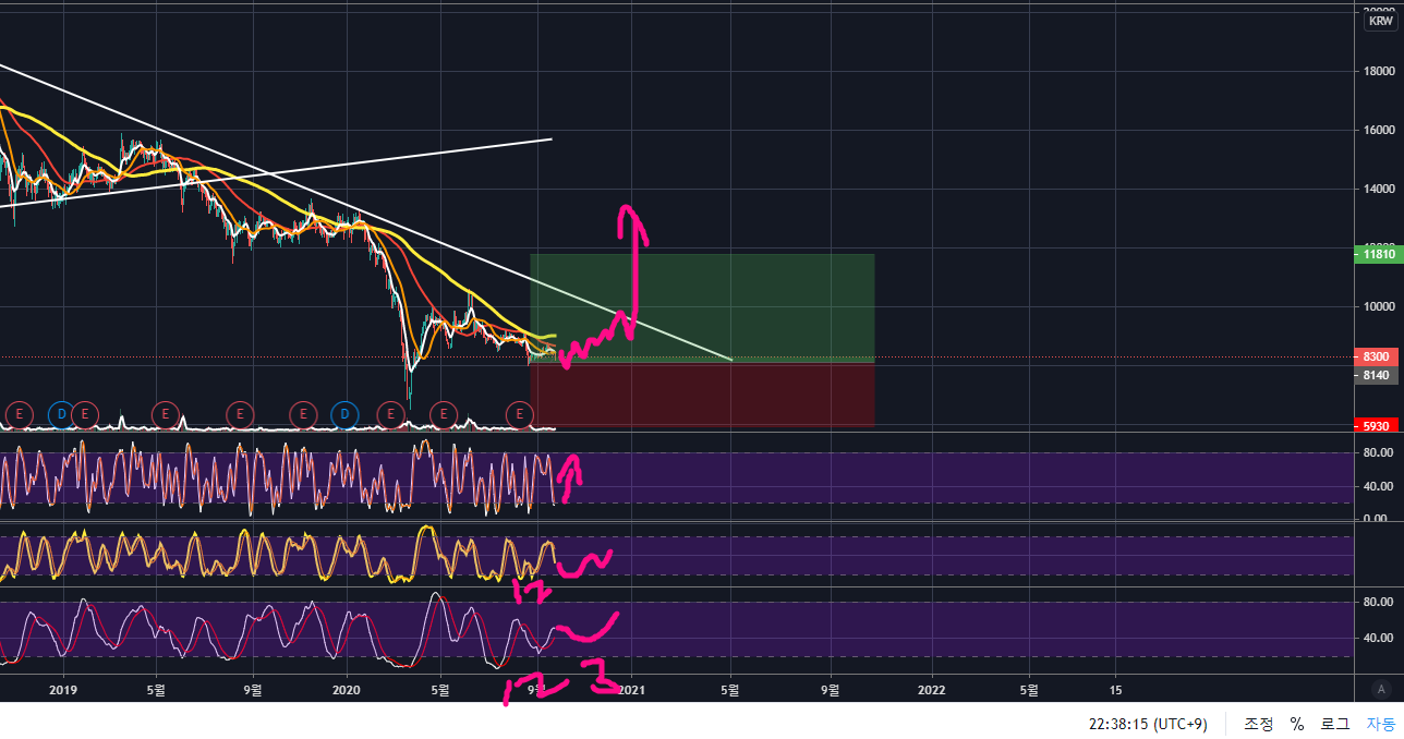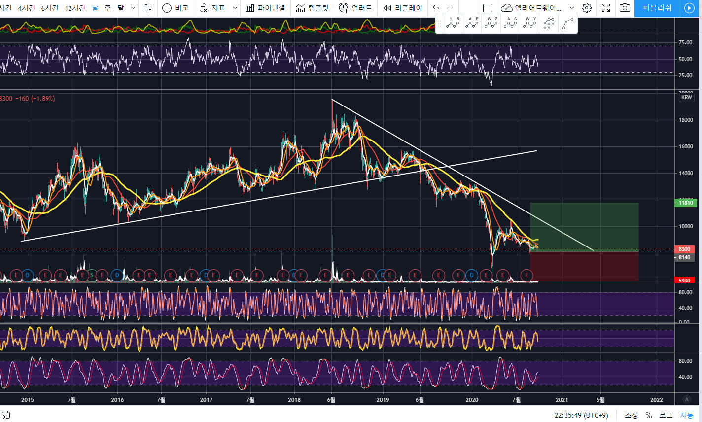 코텍은 기나긴 하락을 진행하고, 현재 반등할 수 있는 지점에 들어선 것 같습니다.