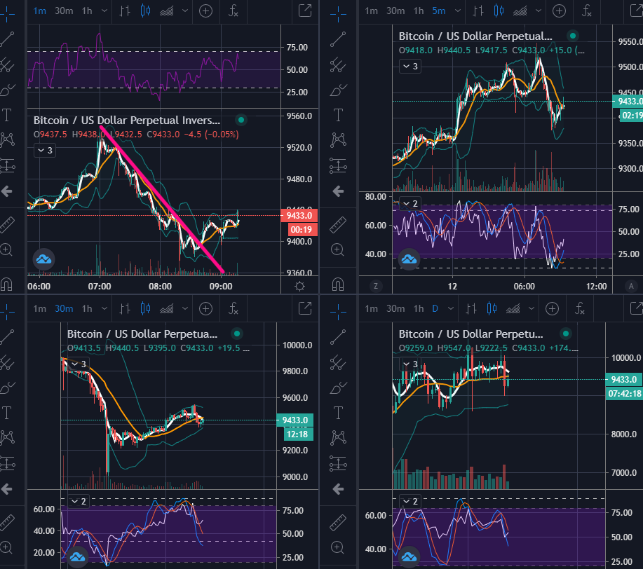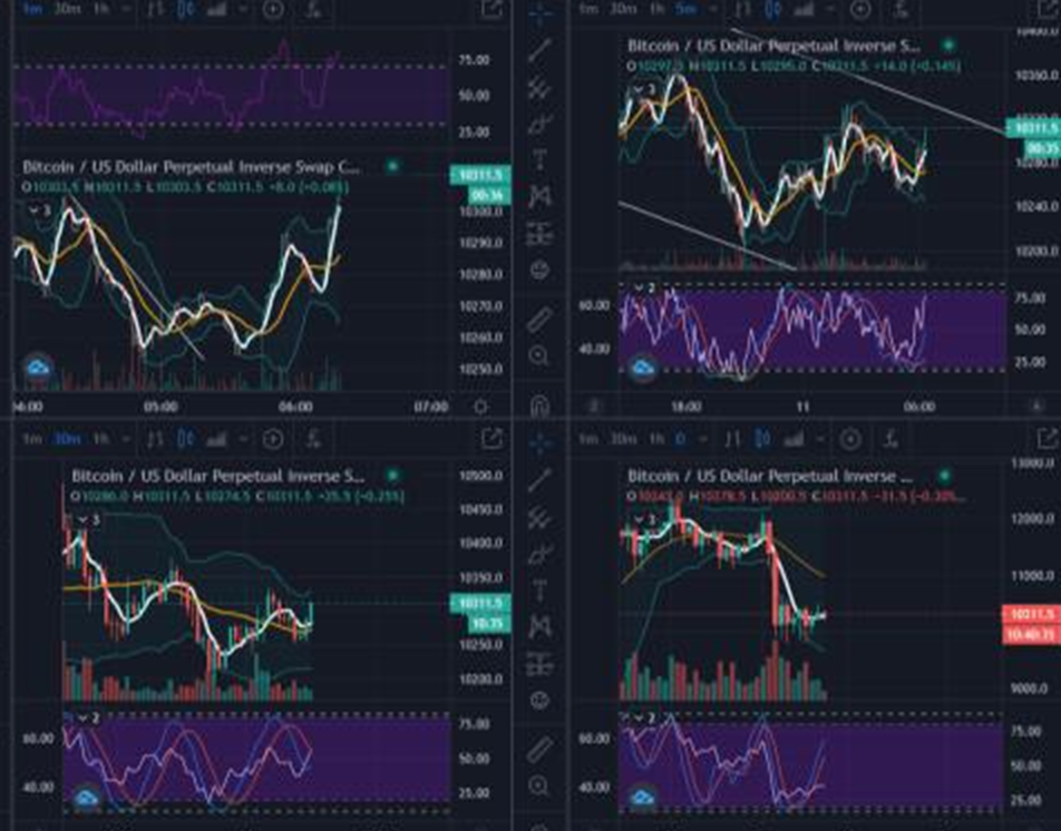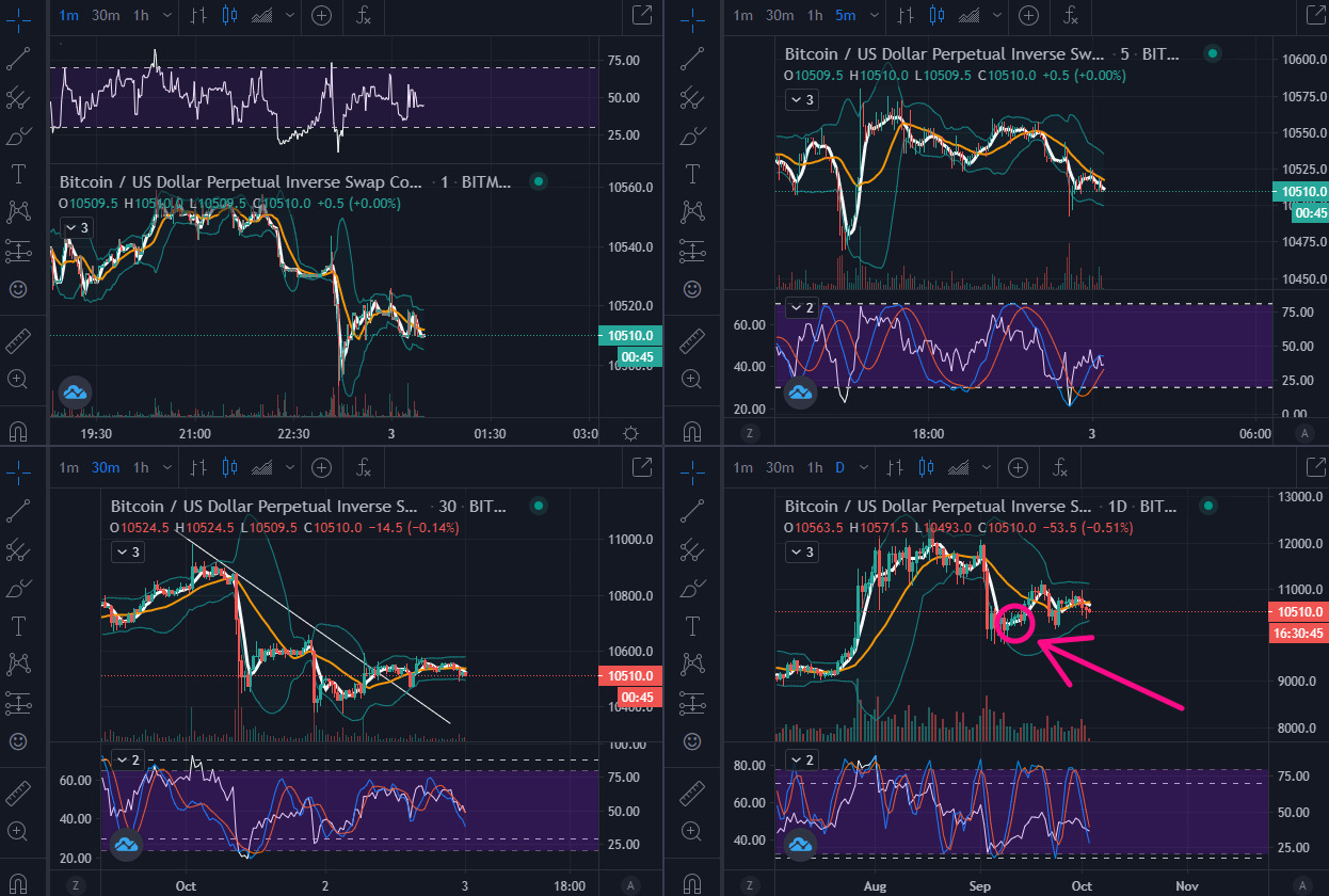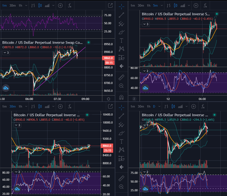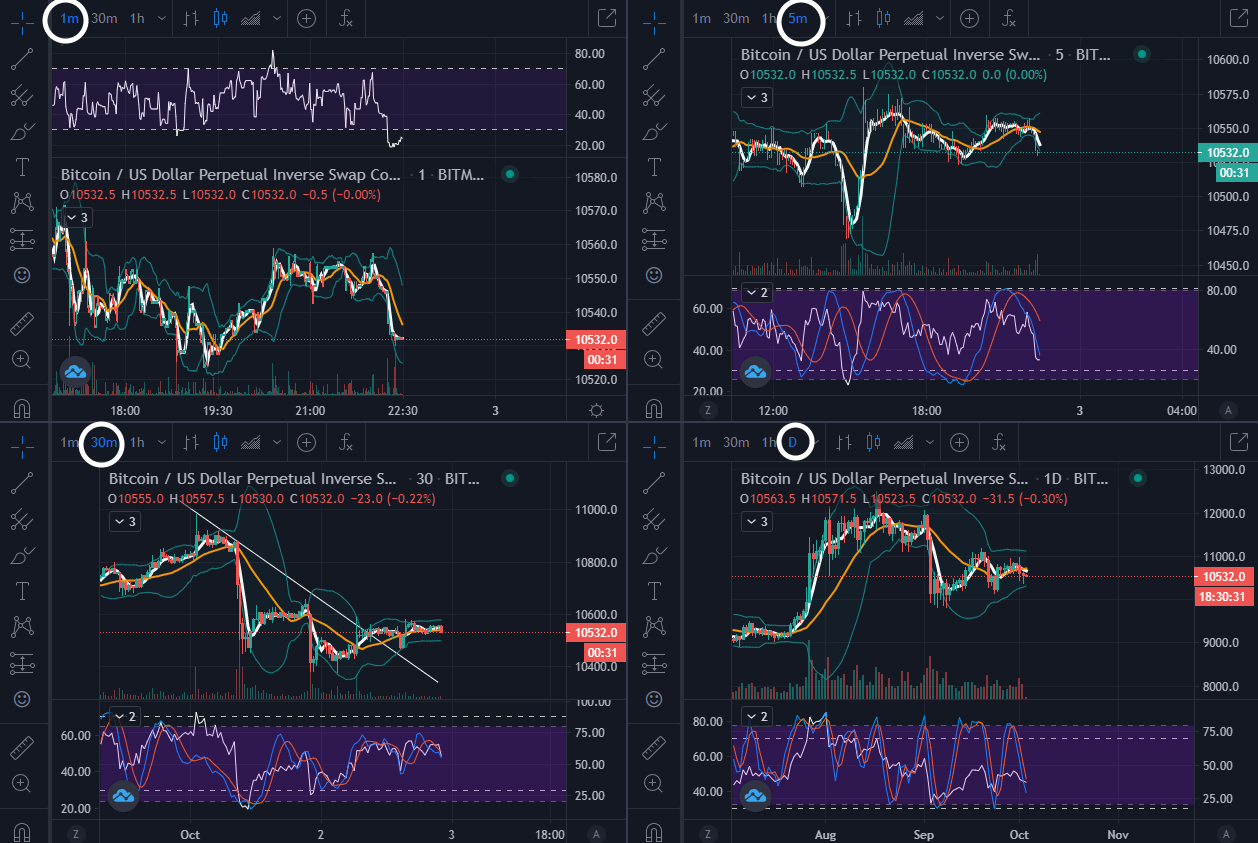 보통은 1일봉 방향을 참고하여, 30분봉과 5분봉을 연계해서 매매하게 됩니다. 1분봉은 단타로 들어가게 되거나 5분/30분 진입의 타점을 찾는 역할을 하고요.