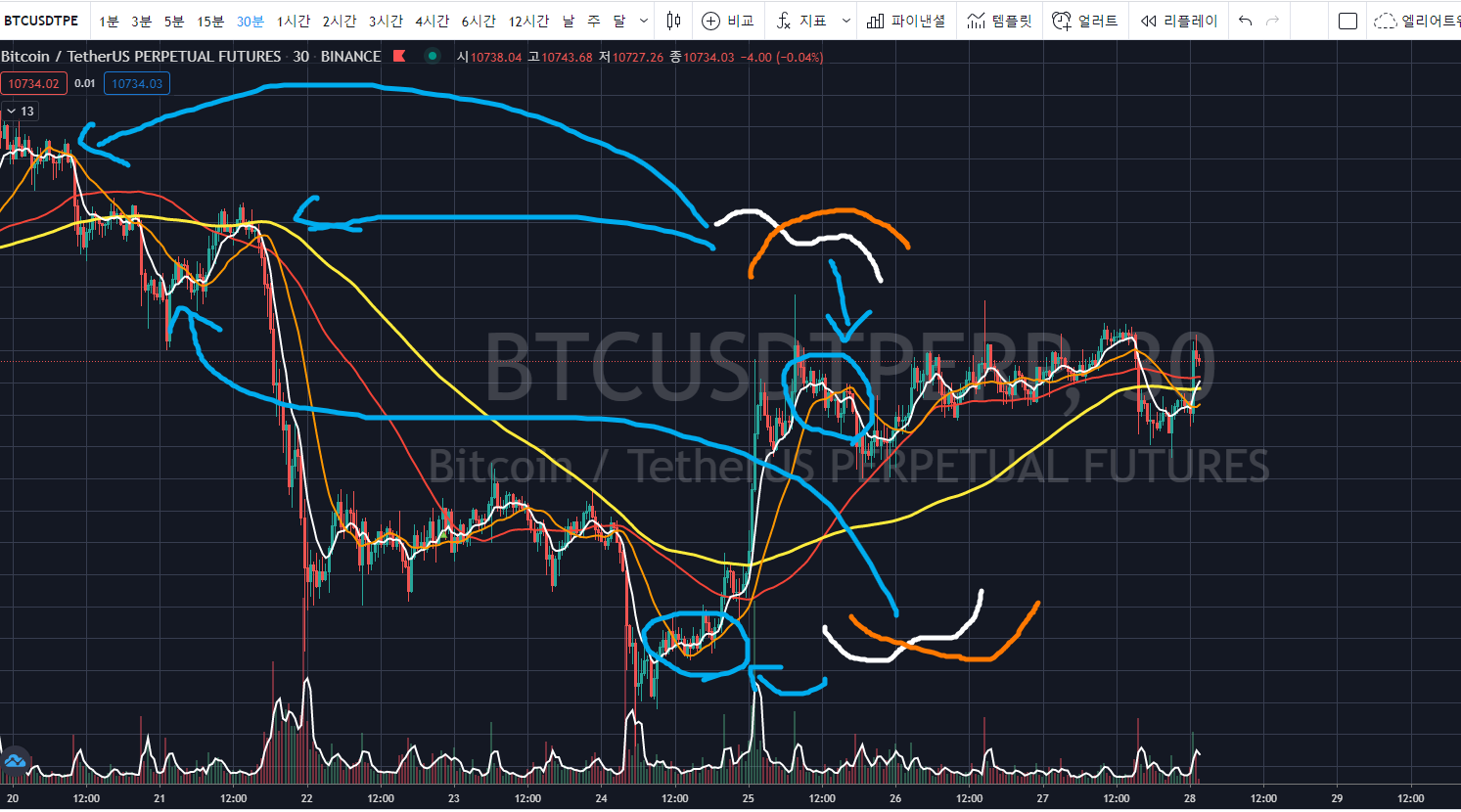 30분봉과 5분봉, 1분봉에서 숏포지션 위주로 매매하는 것이 유리합니다.