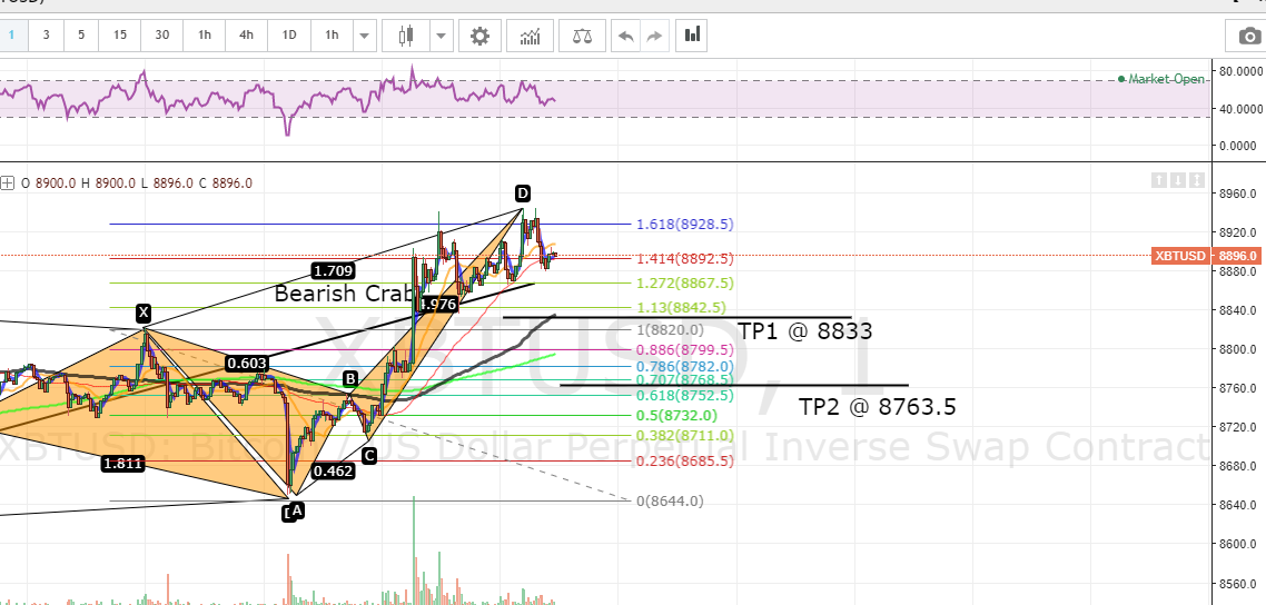 위와 4분할의 해당구간에는 Bearish Crab의 1.618 (XA)의 PRZ를 테스트한 자리이기도 합니다.