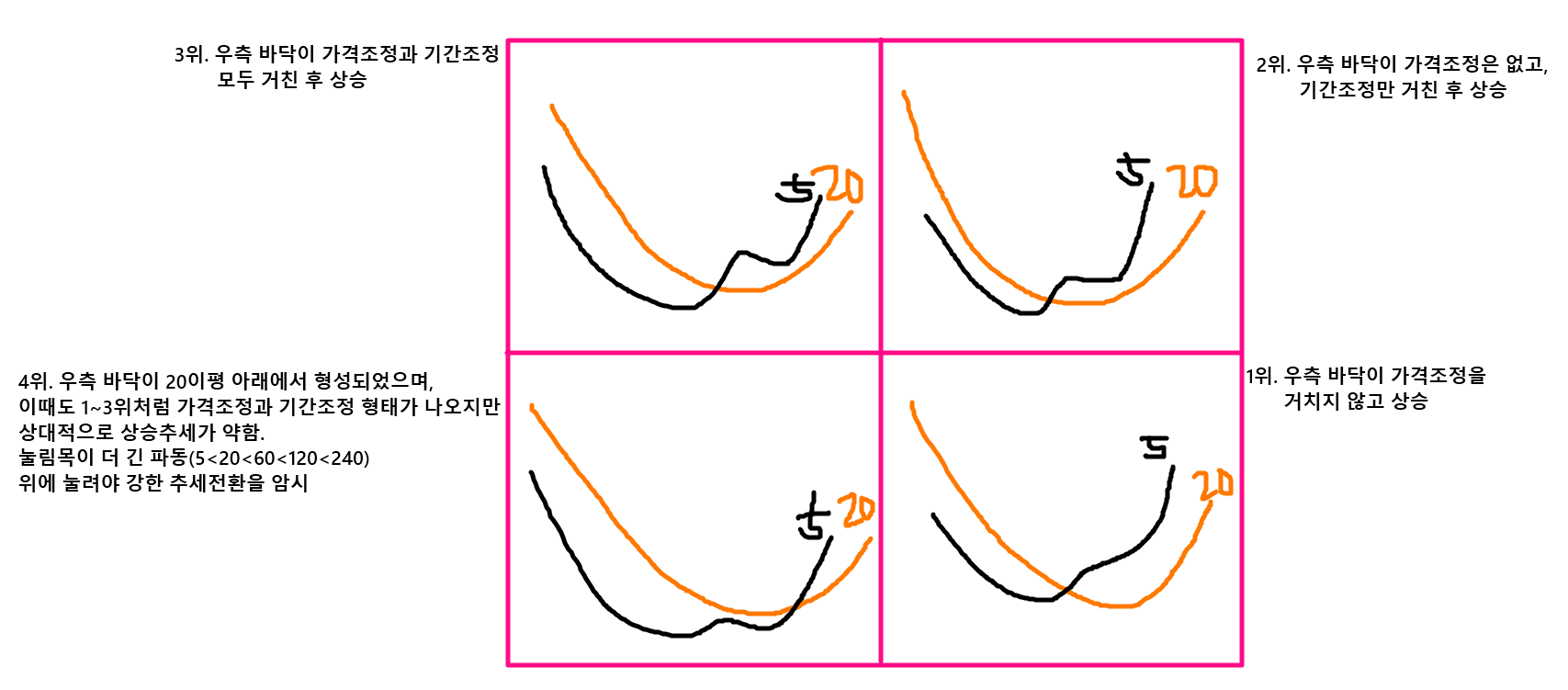 그리고 20이평 위에서 5이평의 쌍바닥이 형성될 때, 5이평이 가격조정과 기간조정을 어떠한 형태로 거치느냐에 따라서도 추세강도가 다릅니다.