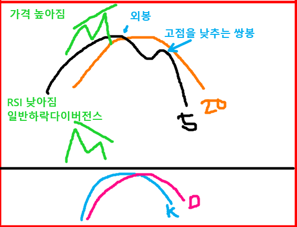주가의 고점을 높아지고 RSI의 고점은 낮아집니다. 이때 RSI 일반하락다이버전스가 적용되구요.