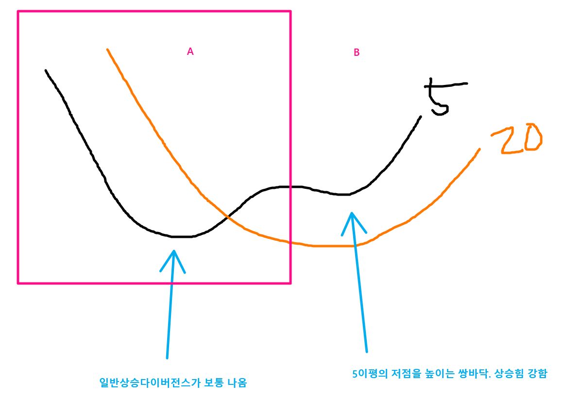 위와 같이 5이평의 우측의 저점을 높이는 쌍바닥이 형성될 때 20이평 위에서 형성되는 것과 아래서 형성되는 것의 추세강도는 다르며,