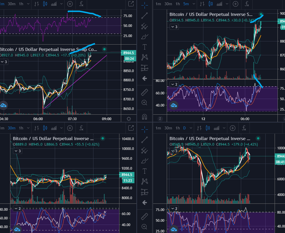 이럴경우 계속해서 홀딩하는 것도 좋지만, 1분봉의 RSI 과열권 진입 및 30분봉 볼린저밴드 상단선 돌파,