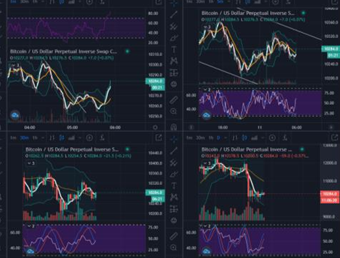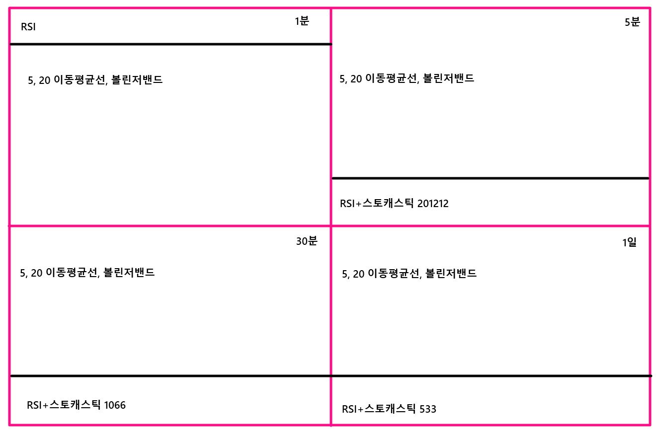 1분봉, 5분봉, 30분봉, 1일봉의 차트를 연이어 켜놓고, 이것에 RSI와 스토캐스틱을 설정합니다.