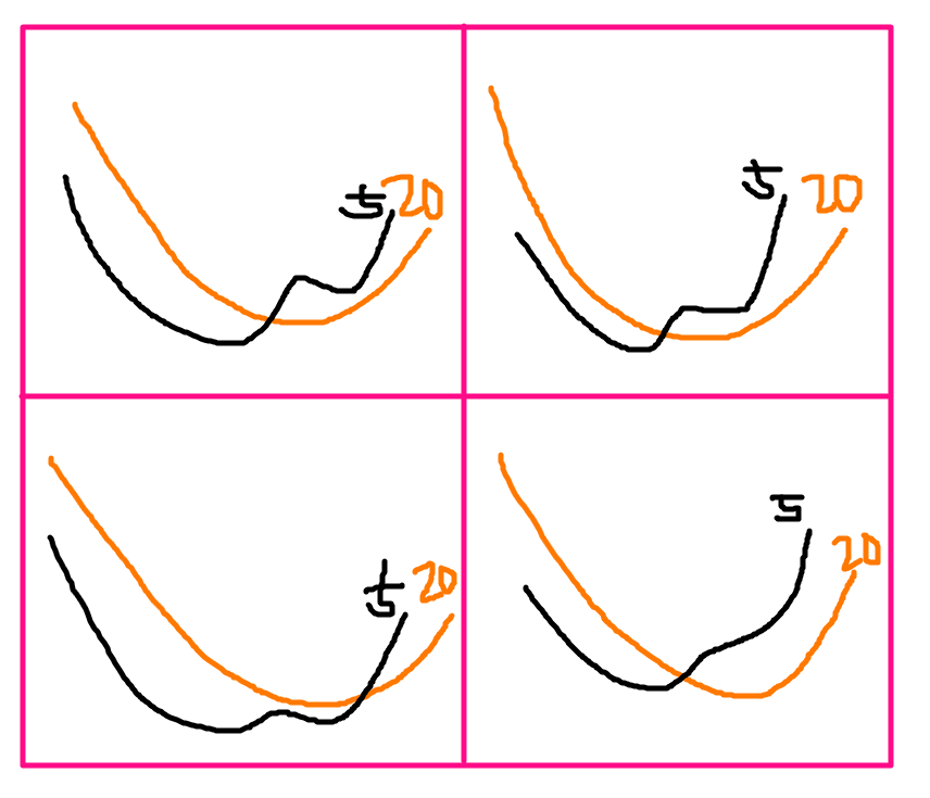 5이평이 20이평 위로 저점을 높이는 쌍바닥이 나오는 경우는 아래와 같이 여러가지가 있습니다.
