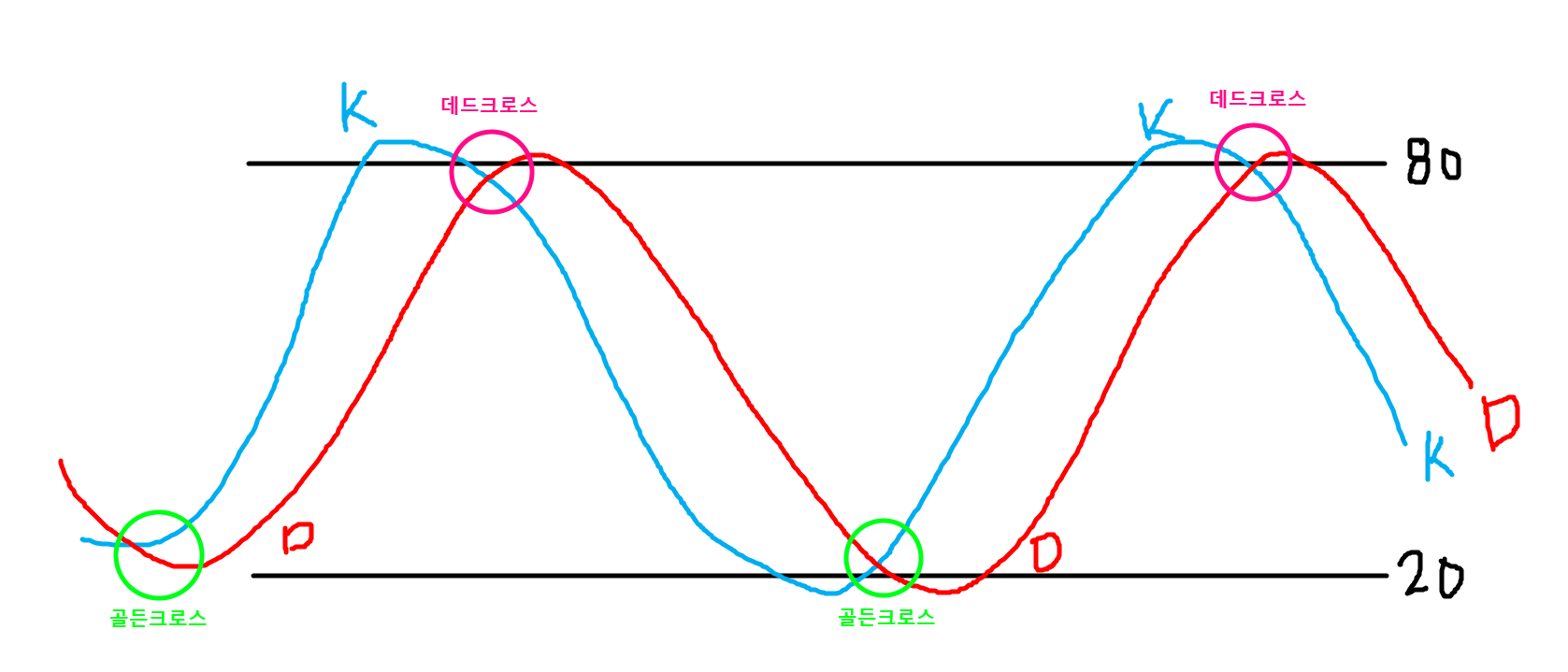 위의 그림처럼 K선이 D선 위로 올라가는 것을 골든크로스라고 하며, 이럴 때 가격을 상승하게 됩니다.
