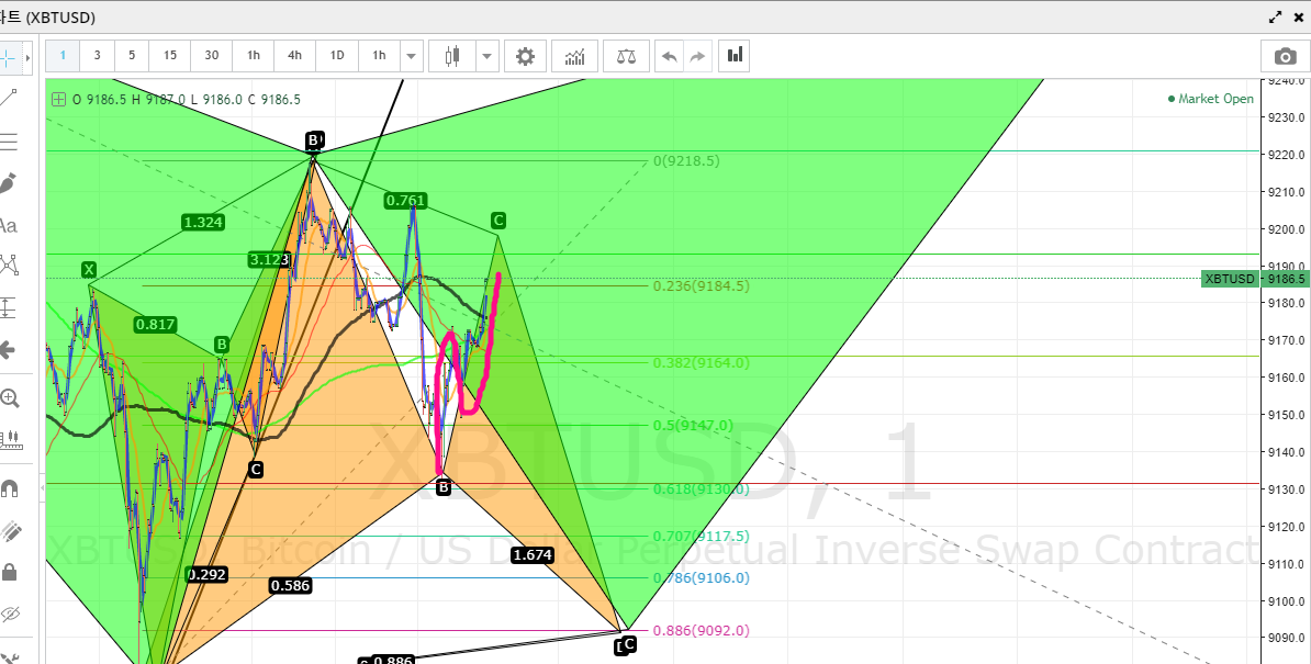 지금 주황색으 Bullish Bat의 B포인트를 찍은 것으로 보고 반등 C포인트를 예측하여
