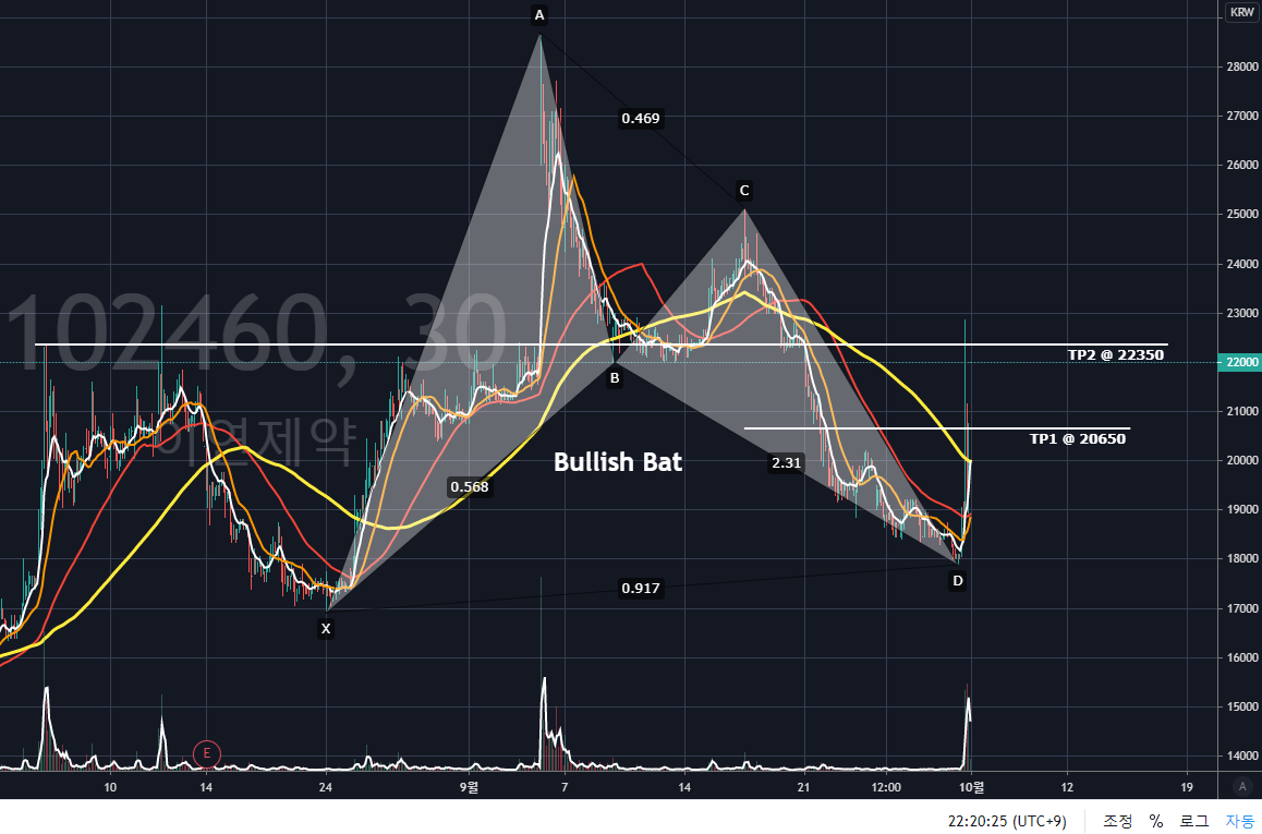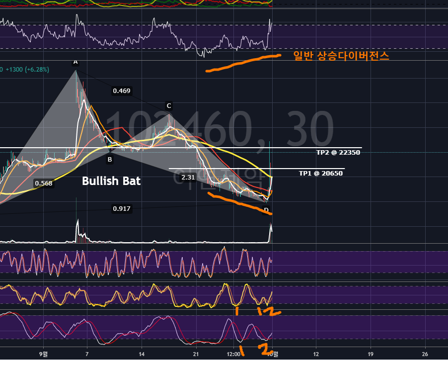 이연제약 30분봉을 보면, Bullish Bat Pattern의 0.886 (XA)의 PRZ를 찍고, 일반 상승다이버전스가 생성된 후 상승반전하였습니다.