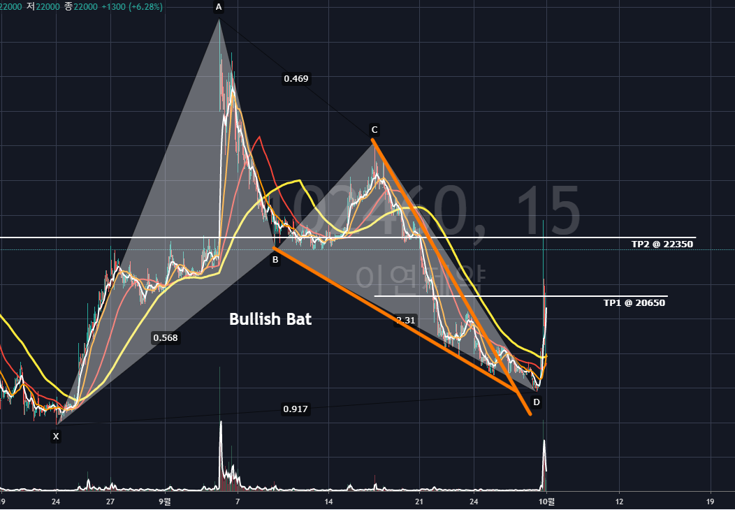 현재 이연제약은 Bullish Bat의 TP2까지 상승한 후 조정 중입니다.