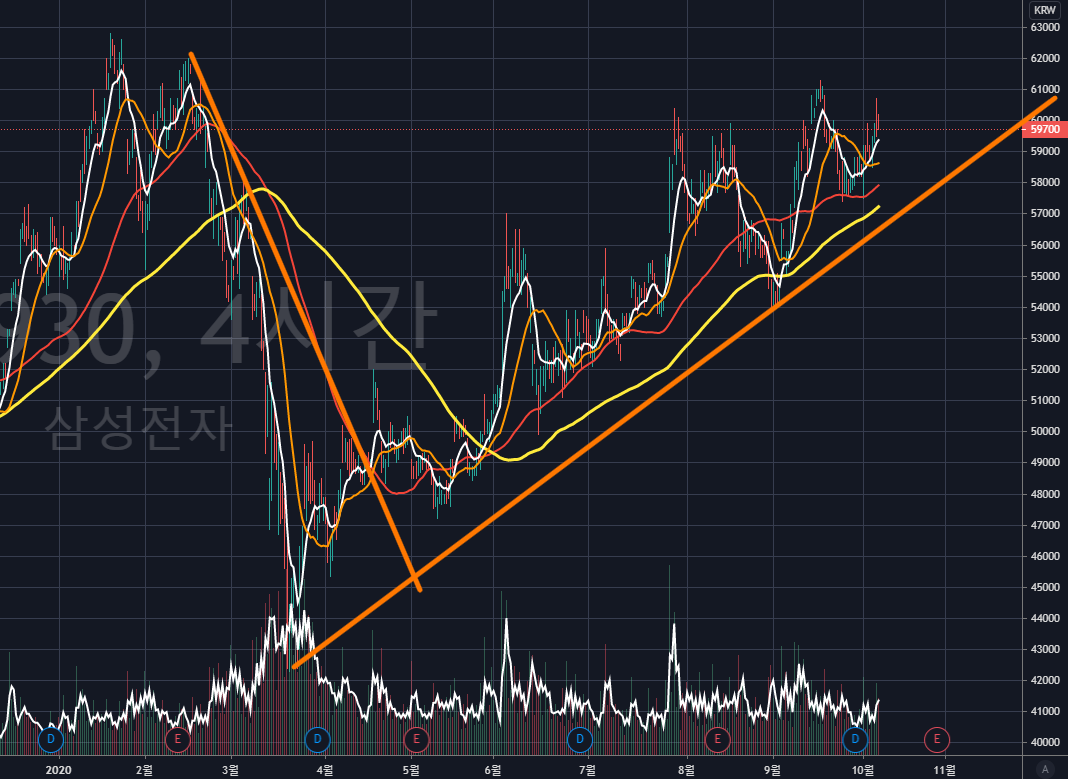 흔히 말하는 코로나19빔에서 큰 하락을 한 삼성전자 주가는, 최근까지 계속해서 상승을 하였습니다.