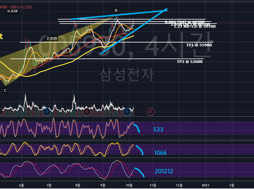 삼성전자는 10월 11일 현재 59700원입니다. 하락반전한 주가는 단기간에 55900원까지 하락할 것으로 보이며, 반등 후 재차하락하여 TP2인 52600까지의 하락도 보입니다. 이후의 흐름은 해당시기에 다시 기술적 분석을 하는 것이 좋아보입니다.